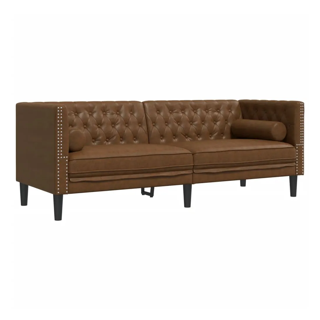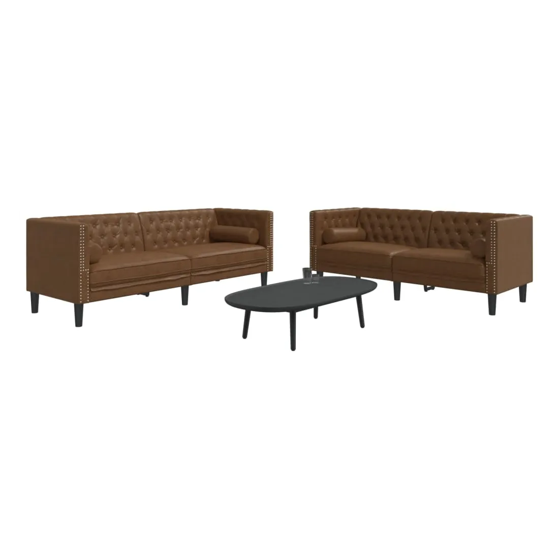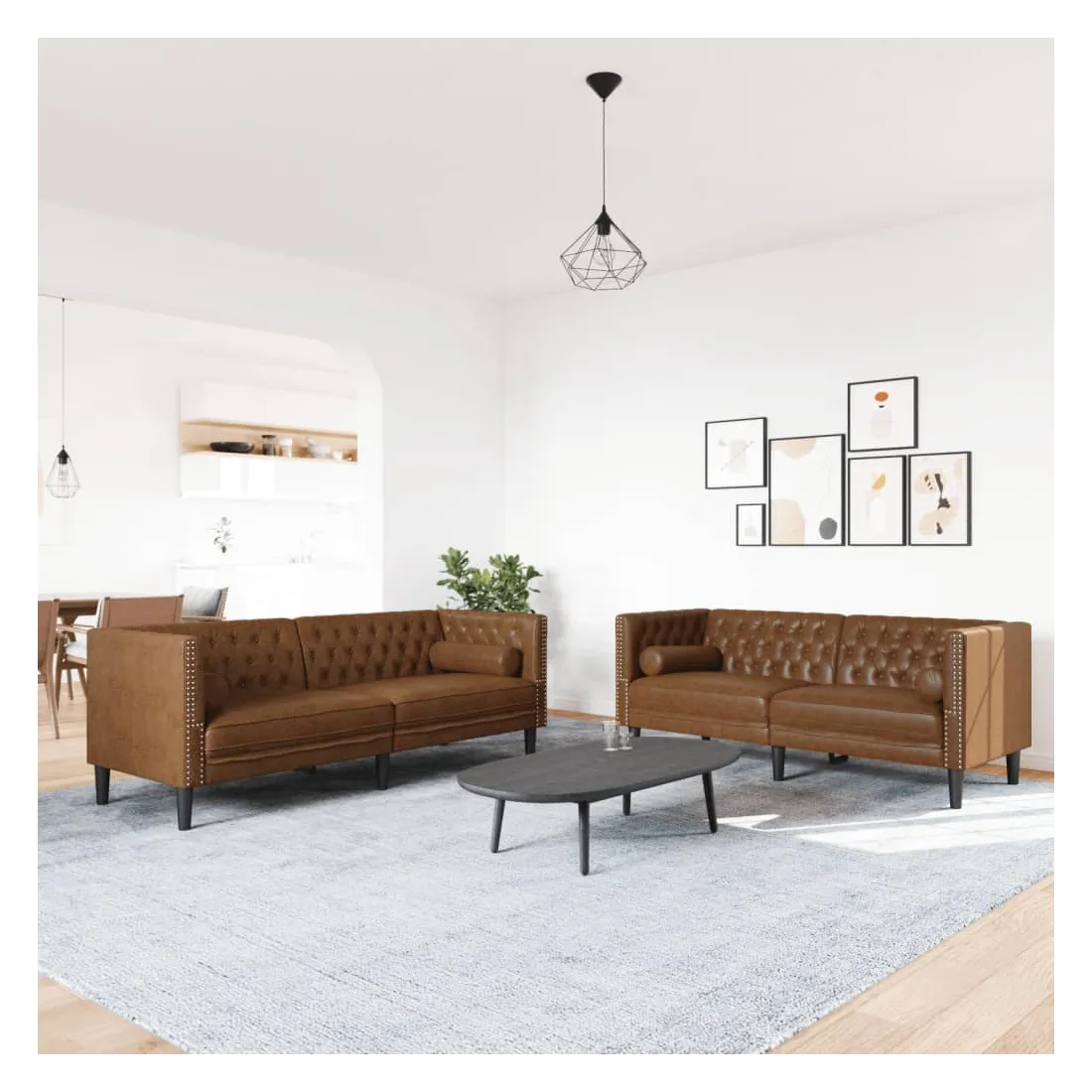 Cet ensemble de canapé Chesterfield est un excellent endroit pour discuter, lire, regarder la télévision ou simplement se détendre. Il est destiné à être un point central dans votre maison. Doux et durable : le similicuir daim est composé de fibres ultra-fines, particulièrement résistantes aux taches. Le similicuir daim est un excellent choix pour le rembourrage des meubles en raison de sa durabilité et de son nettoyage facile.Expérience d'assise confortable : le canapé est très confortable avec les sièges, les accoudoirs et les oreillers de dossier bien rembourrés. Les traversins inclus ne font pas qu'embellir votre décor, ils peuvent aussi ajouter un confort supplémentaire lorsque vous êtes assis ou allongé.Style Chesterfield : avec le dossier et les accoudoirs classiques à boutons tuftés, et une hauteur de dossier et d'accoudoir uniforme, le canapé rehaussera n'importe quelle pièce, offrant à la fois style et confort.Pieds de soutien : le canapé rembourré est soutenu par des pieds robustes, qui assurent sa stabilité, sa sécurité et sa fermeté.