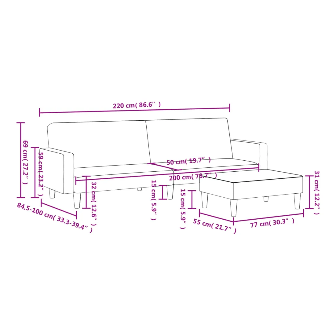 - Dimensions totales : 220 x 84,5 x 69 cm (L x l x H)