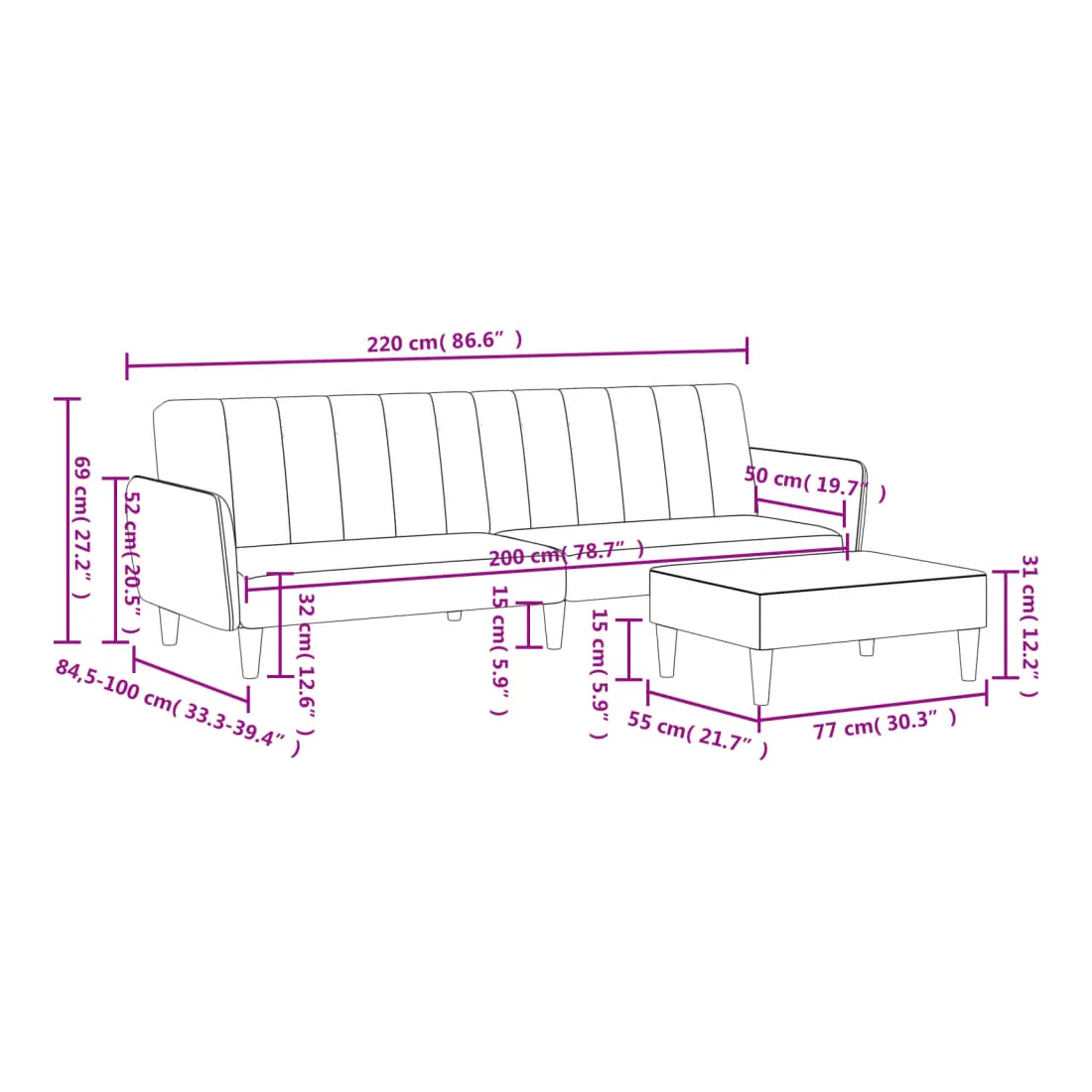 - Dimensions totales : 220 x 84,5 x 69 cm (L x l x H)