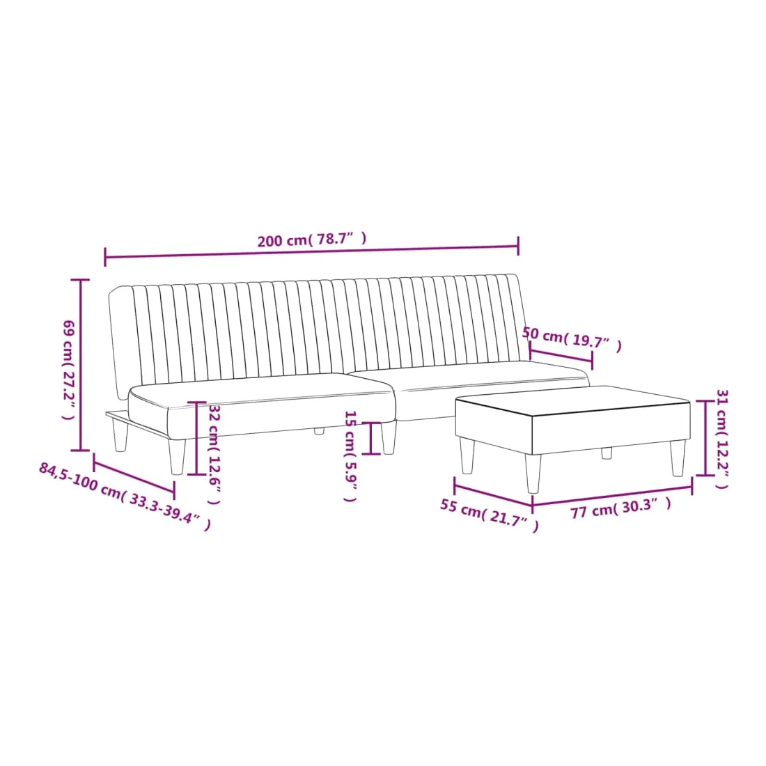 - Dimensions totales : 200 x 84,5 x 69 cm (l x P x H)