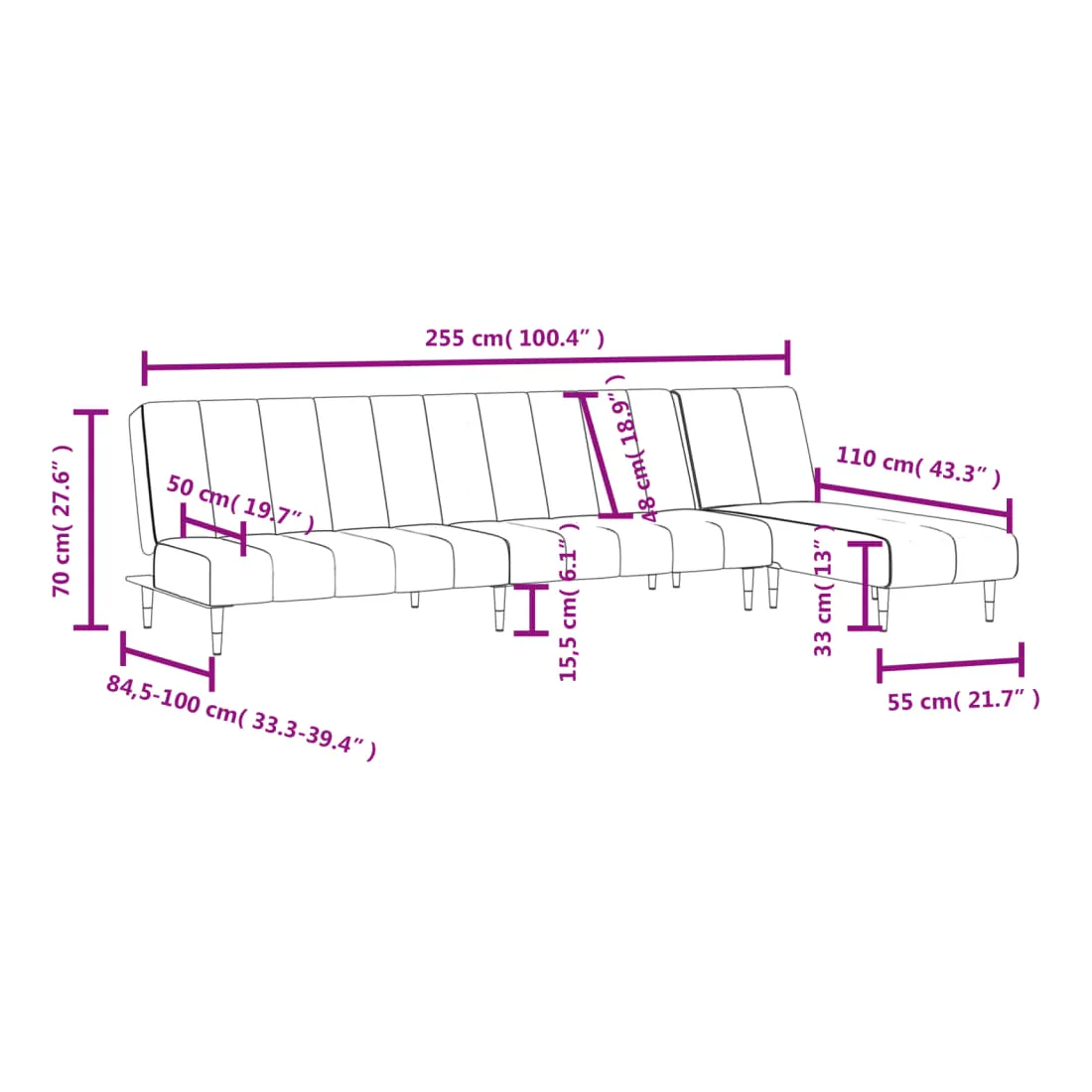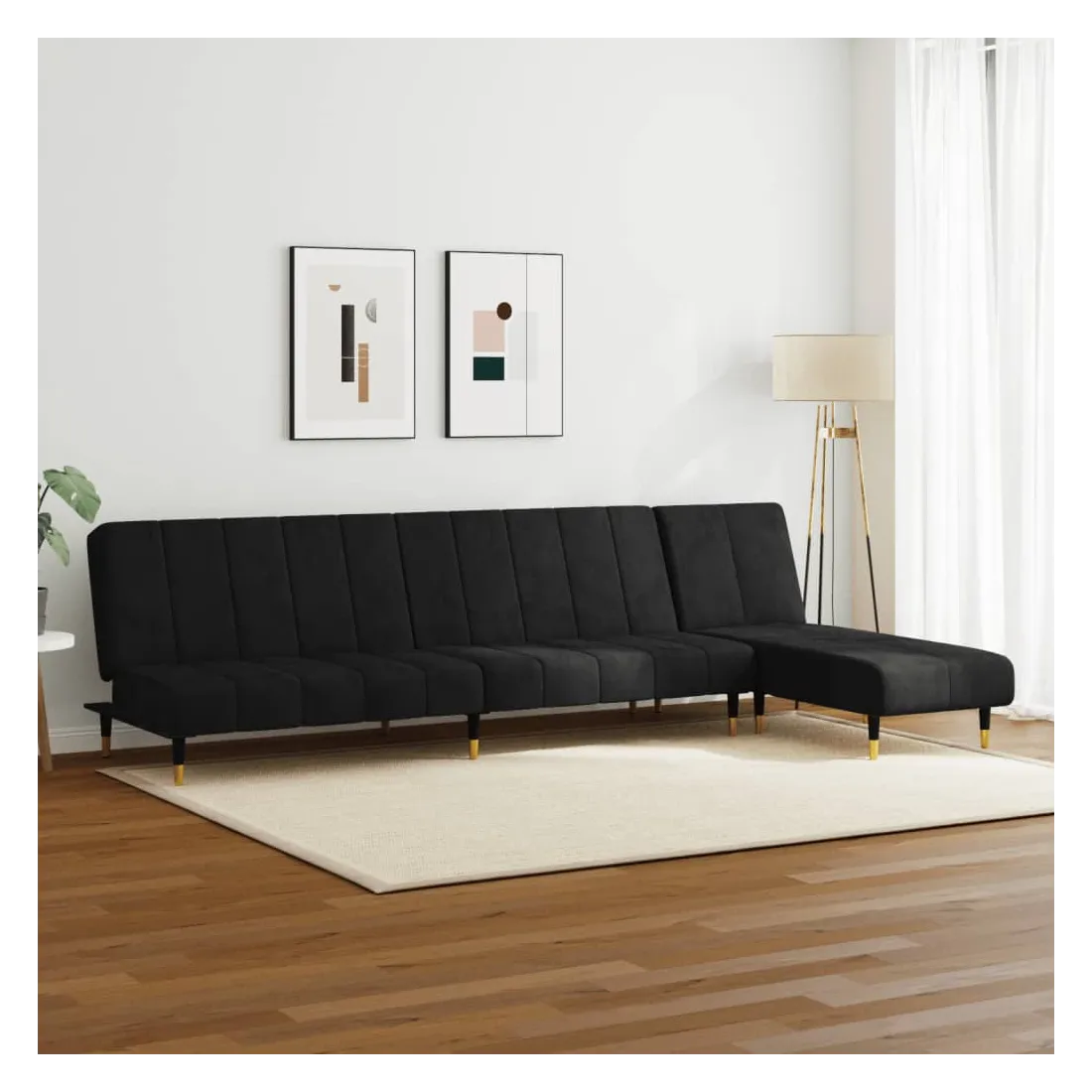 Cet ensemble de canapés est un excellent endroit pour discuter, lire, regarder la télévision ou simplement vous détendre. Il est destiné à être un point central de votre maison. Velours doux : le velours est un tissu doux et confortable, agréable au toucher.Fonction 2 en 1 : le canapé-lit se transforme rapidement et facilement d'un canapé en un lit et à nouveau en canapé. Vous pouvez pousser les deux dossiers séparés partiellement ou complètement vers le bas pour créer un endroit idéal pour une sieste ou un lit double. Chaise longue multifonctionnelle : la chaise longue est un choix judicieux pour les espaces limités. Elle offre trois positions convertibles pour s'asseoir, se prélasser et dormir. Elle peut donc être une chaise longue inclinable confortable pour un usage quotidien ou un lit temporaire pour les invités.Expérience de siège confortable : le canapé de relaxation est très confortable grâce à l'assise et au dossier bien rembourrés.Cadre solide et stable : ce canapé est doté d’un cadre en bois qui offre stabilité et robustesse.