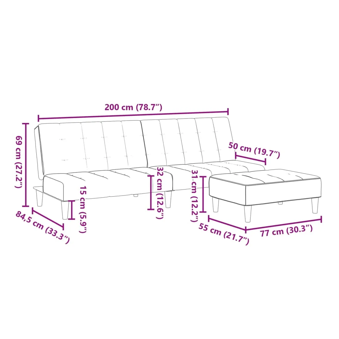 - Dimensions totales : 200 x 84,5 x 69 cm (L x l x H)