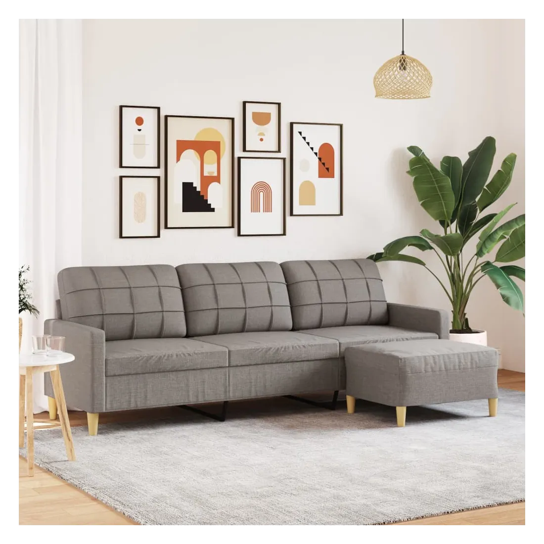 Ce canapé à 3 places est un excellent endroit pour discuter, lire, regarder la télévision ou simplement vous détendre. Il est destiné à être un point central dans votre maison. Matériau doux et durable : le tissu en polyester offre une combinaison de douceur, de respirabilité et de durabilité, vous garantissant un confort et une convivialité ultimes.Cadre robuste et stable : le cadre en métal du canapé de salon assure robustesse et stabilité.Expérience d'assise confortable : le canapé est très confortable avec les sièges, les accoudoirs et les oreillers de dossier bien rembourrés.Pouf polyvalent : le tabouret est polyvalent, servant de repose-pieds confortable lorsque vous vous allongez sur le canapé ou de siège supplémentaire dans votre jardin. De plus, le design simple et la taille compacte le rendent idéal pour presque tous vos espaces de vie.Design accrocheur : doté d'un design simple mais moderne, ce canapé est destiné à attirer l'attention dans votre chambre.