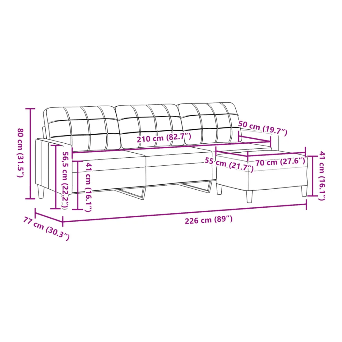 - Dimensions totales : 226 x 77 x 80 cm (l x P x H)