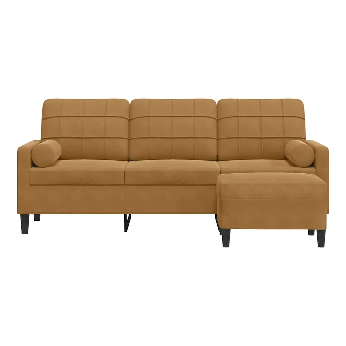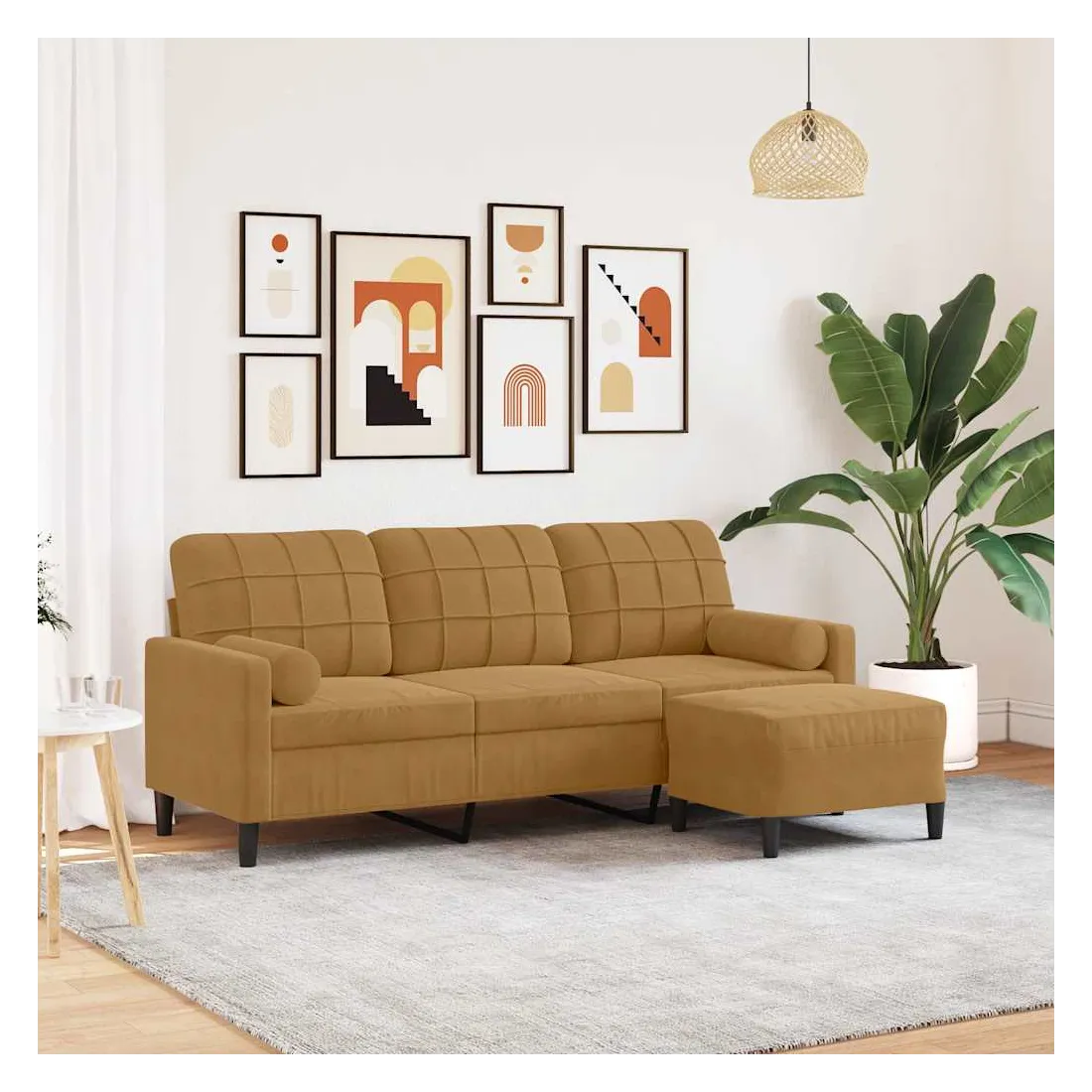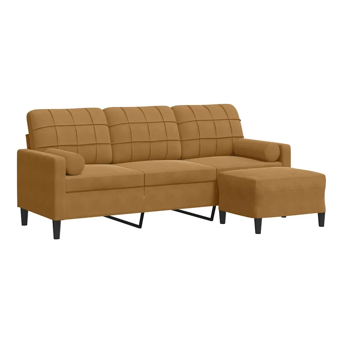 Ce canapé à 3 places est un excellent endroit pour discuter, lire, regarder la télévision ou simplement vous détendre. Il est destiné à être un point central dans votre maison. Matériau doux et confortable : le tissu en velours présente une surface douce et lisse qui offre une sensation agréable contre la peau, vous apportant chaleur et confort ultime.Cadre robuste et stable : le cadre en métal du canapé de salon assure robustesse et stabilité.Expérience d'assise confortable : le canapé est très confortable avec les sièges, les accoudoirs et les oreillers de dossier bien rembourrés.Pouf polyvalent : le tabouret est polyvalent, servant de repose-pieds confortable lorsque vous vous allongez sur le canapé ou de siège supplémentaire dans votre jardin. De plus, le design simple et la taille compacte le rendent idéal pour presque tous vos espaces de vie.Design accrocheur : doté d'un design simple mais moderne, ce canapé est destiné à attirer l'attention dans votre chambre.