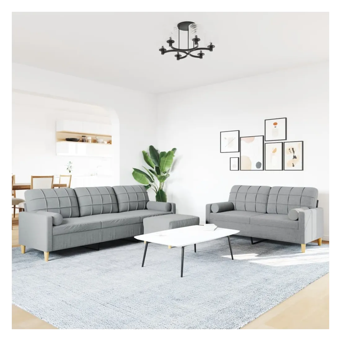 Cet ensemble de canapés est un excellent endroit pour discuter, lire, regarder la télévision ou simplement vous détendre. Il est destiné à être un point central de votre maison. Matériau doux et durable : le tissu en polyester offre une combinaison de douceur, de respirabilité et de durabilité, vous garantissant un confort et une convivialité ultimes. Cadre robuste et stable : le cadre en métal du canapé en tissu assure robustesse et stabilité. Expérience d'assise confortable : le canapé est très confortable avec les sièges, les accoudoirs et les oreillers de dossier bien rembourrés. Oreillers cylindriques pratiques : ces oreillers cylindriques non seulement embellissent votre décor, mais ils peuvent également apporter un confort supplémentaire lorsque vous êtes assis ou allongé. Pouf polyvalent : ce repose-pied convient pour reposer vos pieds lorsque vous êtes allongé dans un canapé, ou pour vous offrir un siège supplémentaire dans votre pièce. De plus, le design simple et la taille compacte le rendent idéal pour presque tous vos espaces de vie.