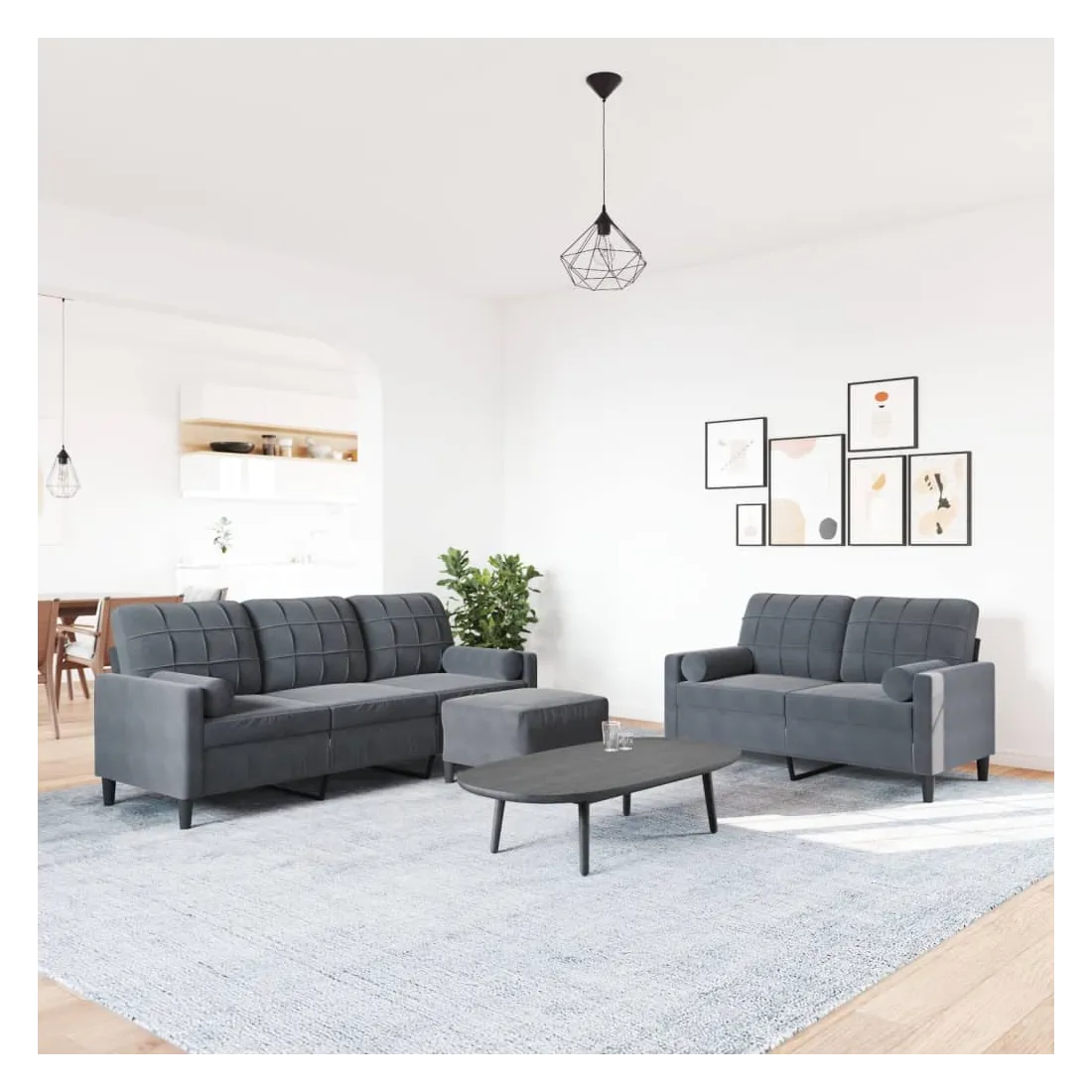 Cet ensemble de canapés est un excellent endroit pour discuter, lire, regarder la télévision ou simplement vous détendre. Il est destiné à être un point central de votre maison. Matériau doux et confortable : le tissu en velours présente une surface douce et lisse qui offre une sensation agréable contre la peau, vous apportant chaleur et confort ultime.Cadre robuste et stable : le cadre en métal du canapé de salon assure robustesse et stabilité.Expérience d'assise confortable : le canapé est très confortable avec les sièges, les accoudoirs et les oreillers de dossier bien rembourrés.Pouf polyvalent : ce repose-pied convient pour reposer vos pieds lorsque vous êtes allongé dans un canapé, ou pour vous offrir un siège supplémentaire dans votre pièce. De plus, le design simple et la taille compacte le rendent idéal pour presque tous vos espaces de vie.Design accrocheur : doté d'un design simple mais moderne, ce canapé est destiné à attirer l'attention dans votre chambre.