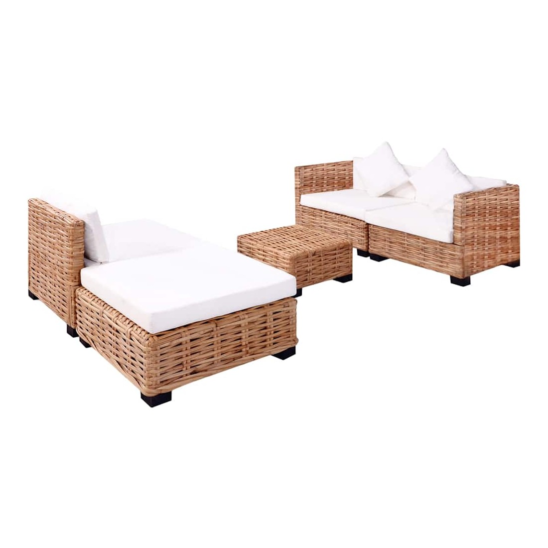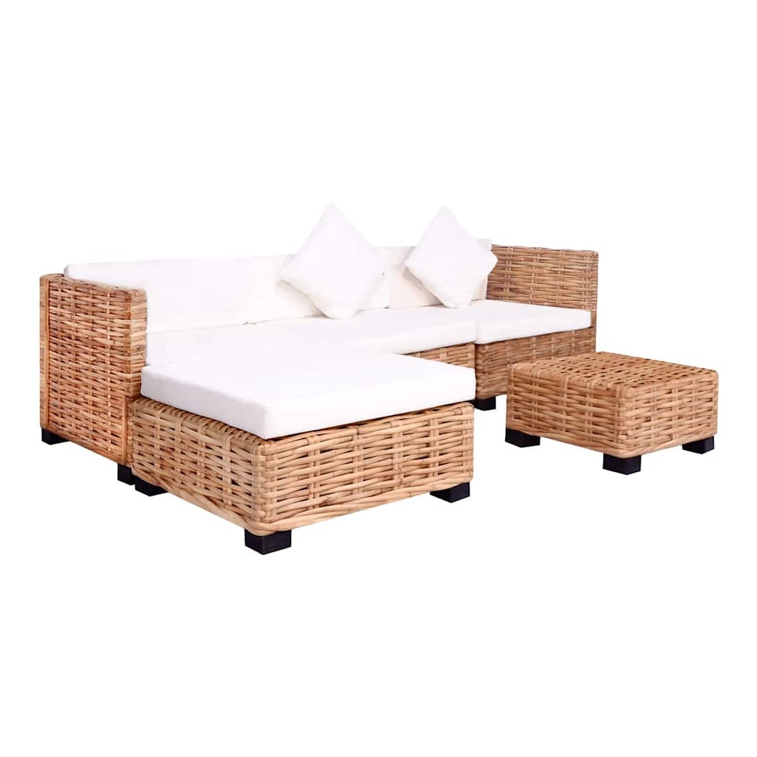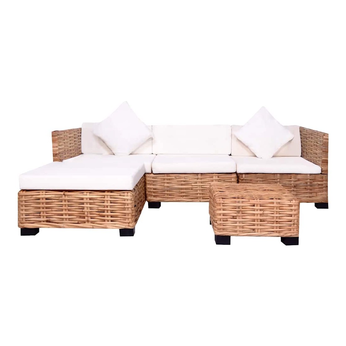 L'ensemble de canapés élégant et fonctionnel sera un excellent ajout à votre salon ! Le cadre est recouvert de rotin naturel, qui est non seulement attrayant avec son aspect naturel et ses motifs de tissage décoratifs, mais il est également durable concernant son utilisation. Les pieds du canapé sont en bois d'acajou de haute qualité. Les coussins ajoutent du confort et une sensation confortable. L'ensemble ajoutera un aperçu rustique à votre espace de vie ! L'assemblage est facile. La livraison comprend 2 segments de canapé d'angle, 1 segment de canapé central, 1 pouf, 1 table basse, 3 coussins de siège, 3 coussins de dossier, 1 coussin de pouf et 2 oreillers. Maximum 110 kg par siège. Soyez conscient du risque de feux ouverts et d'autres sources de forte chaleur à proximité du produi
