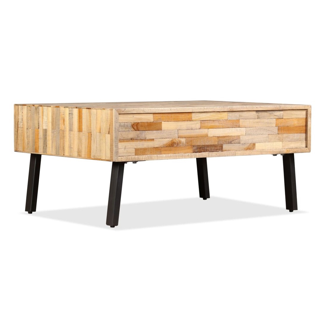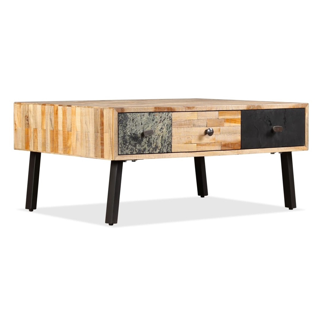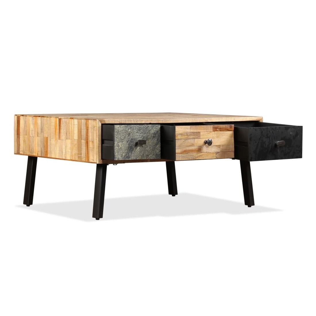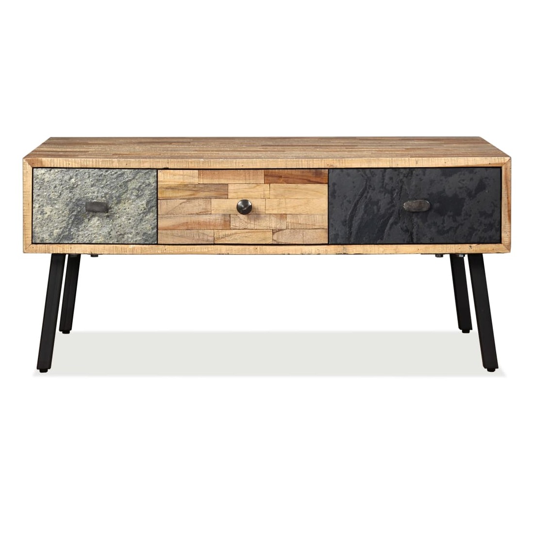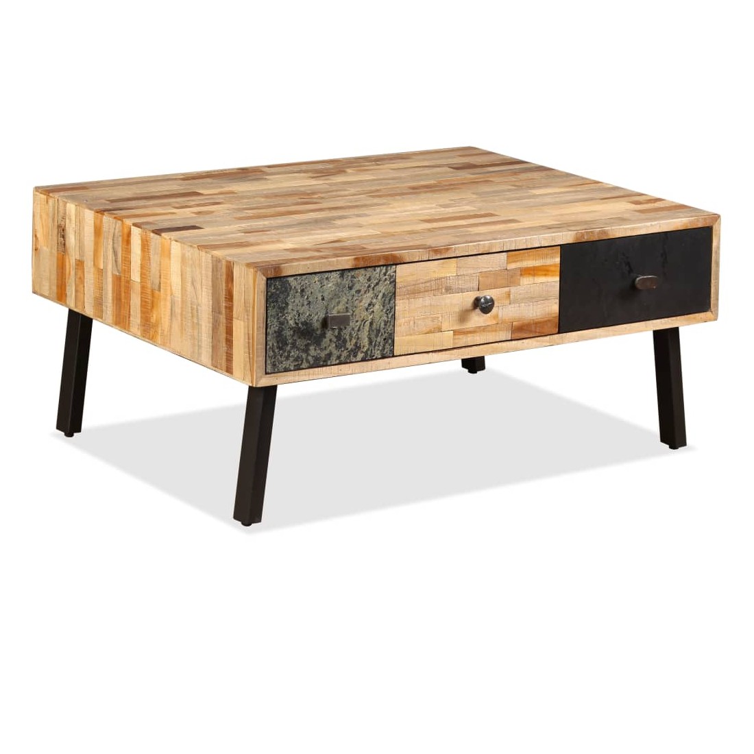 Cette table basse de style vintage sera un accessoire intemporel pour le décor de votre maison. La table basse est faite de teck de récupération, qui est solide, stable, durable et beau. Son dessus de table en bois massif offre une surface stable et sécurisée sur laquelle vous pouvez placer vos boissons, vases, bols à fruits ou ornements, tandis que vous pouvez garder vos petits objets tels que des clés, des blocs-notes, des stylos et d'autres bibelots dans ses trois grands tiroirs. La surface de tiroir marbrée ajoute au style vintage unique de la table. Un grand soin est apporté à chaque étape du processus de production, qu'il s'agisse de recombinaison, de polissage ou de laquage. L'assemblage est facile. Remarque importante : les couleurs et les grains varient d'une pièce à l'autre, rendant chacune de nos tables basses unique. La livraison est aléatoire, ce qui garantit l'exclusivité et l'individualité de votre produit.