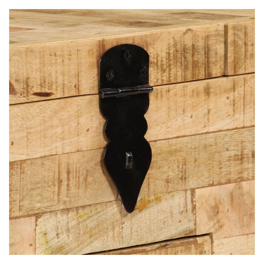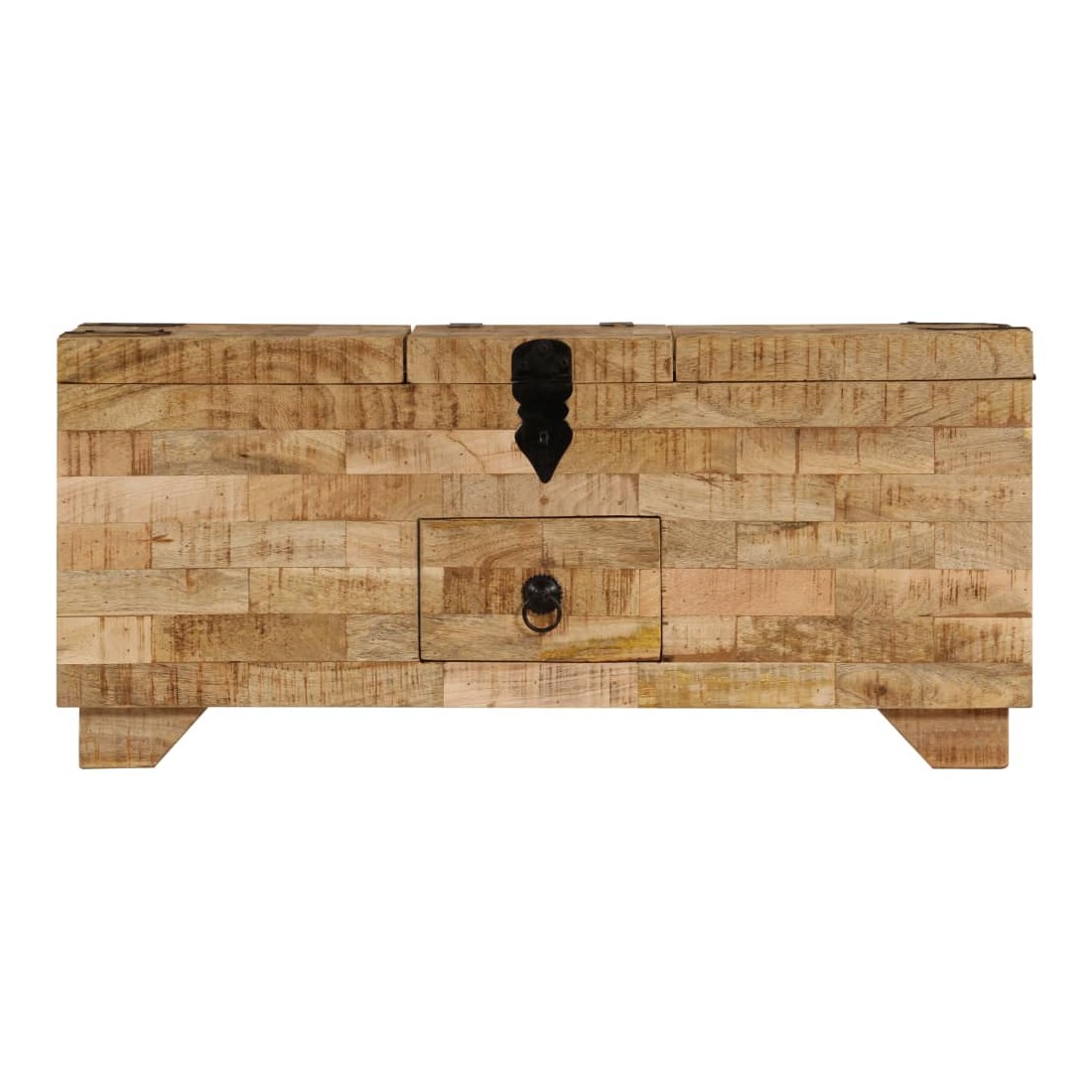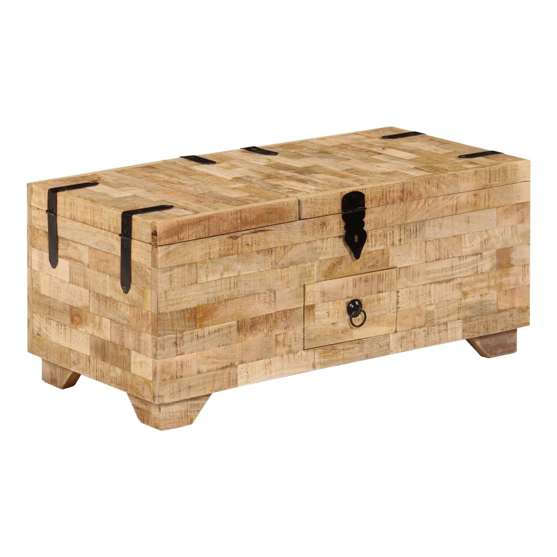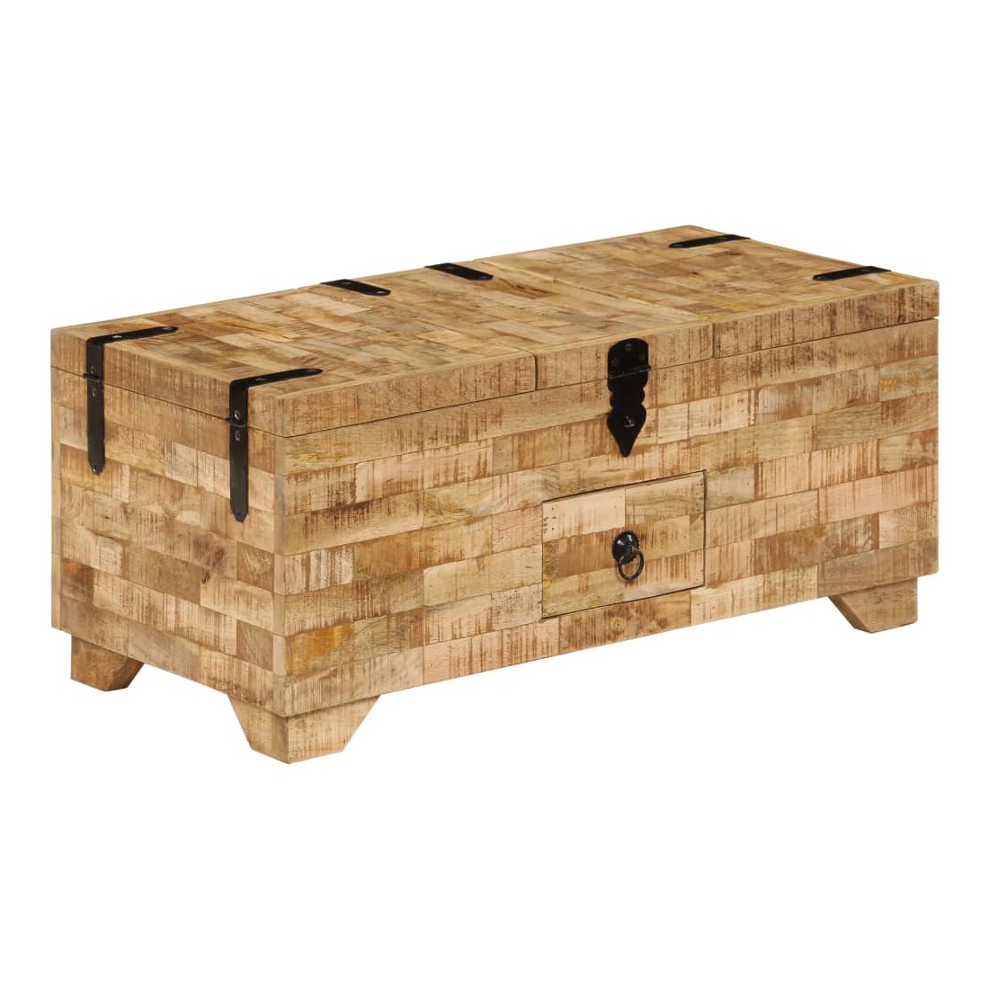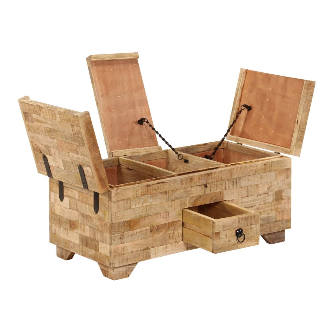 Cette table basse est à la fois élégante et pratique. Elle peut être utilisée comme coffre, mais aussi comme boîte de rangement. Le design gracieux de cette table d'appoint en fera une pièce de résistance dans n'importe quelle pièce. Cette table d'appoint est en bois de manguier solide, ce qui la rend considérablement robuste et durable. Chaque étape du processus de fabrication est réalisée avec le plus grand soin, que ce soit le polissage, la peinture ou le laquage. L'artisanat et les grains de bois esthétiquement attrayants embellissent chaque meuble, le font unique et légèrement différent l'un de l'autre. Elle a trois compartiments et un tiroir. L'assemblage est facile. Remarque importante : les grains et les couleurs du bois peuvent varier d'une pièce à l'autre, ce qui rend chacune de nos tables basses unique. La livraison est aléatoire, ce qui garantit l'exclusivité et l'individualité de votre produit. La serrure n'est pas incluse.
