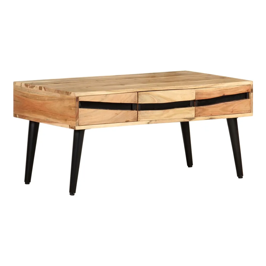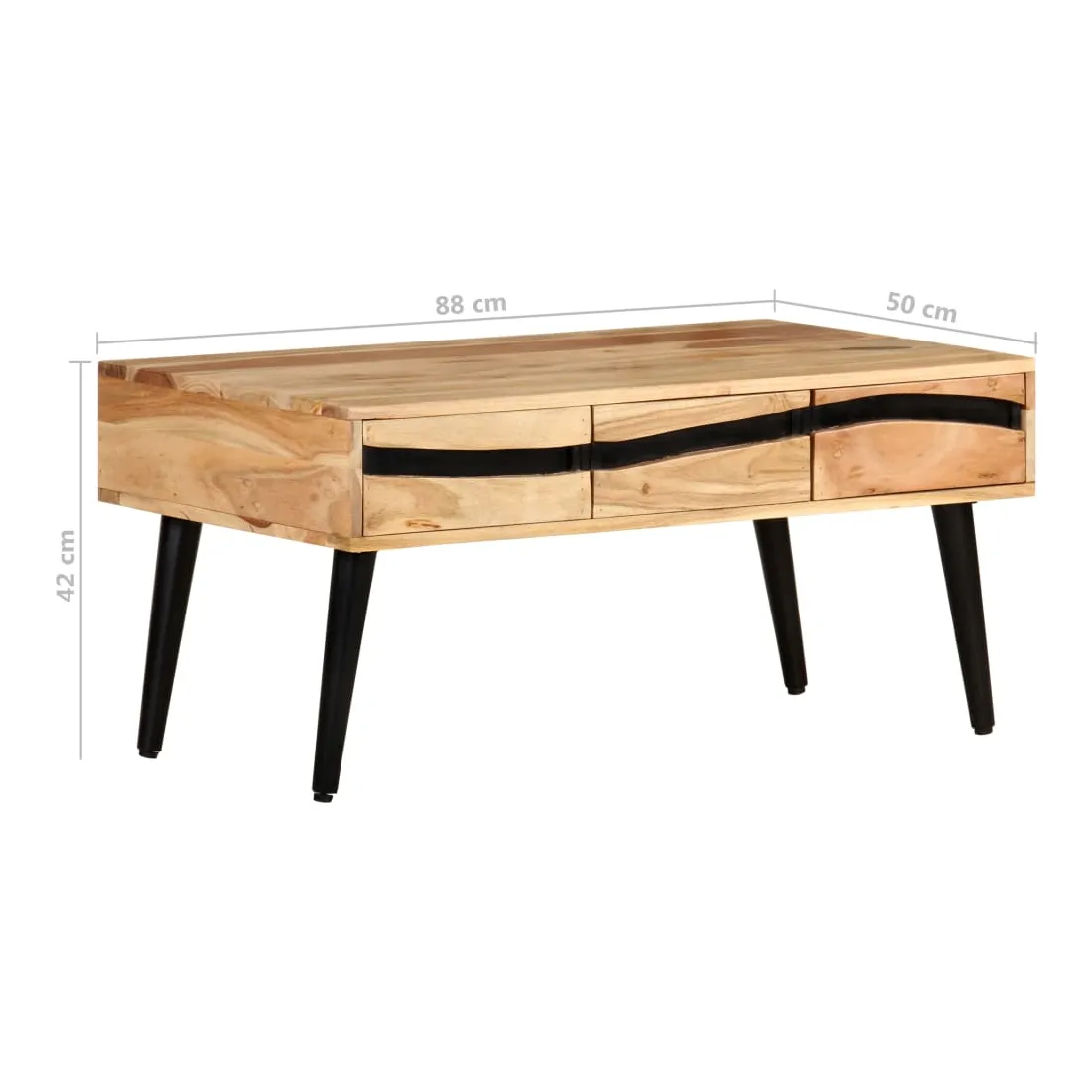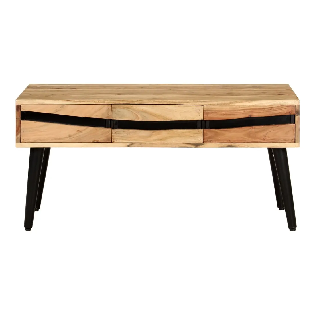 Détendez-vous et profitez du beau temps avec la famille et les amis autour de cette table basse en bois ! La table centrale est fabriquée en bois d’acacia massif, un bois dur avec des grains denses. Cette table de canapé au design magnifique est durable et accrocheuse. De plus, l’artisanat exquis et les beaux grains de bois font chaque pièce légèrement différente l'une de l'autre. Les pieds en fer enduit de poudre ajoutent à sa robustesse. La table en bois dispose de 3 tiroirs avec un grand espace de rangement. Le dessus de table solide offre une surface stable et sécurisée pour vos différents essentiels. Remarque importante : les couleurs varient d'une pièce à l'autre, rendant chaque pièce unique. La livraison est aléatoire, garantissant l'exclusivité et l'individualité de votre produit.