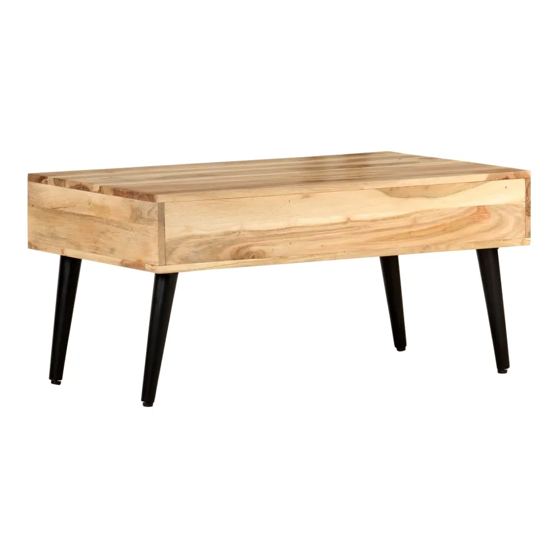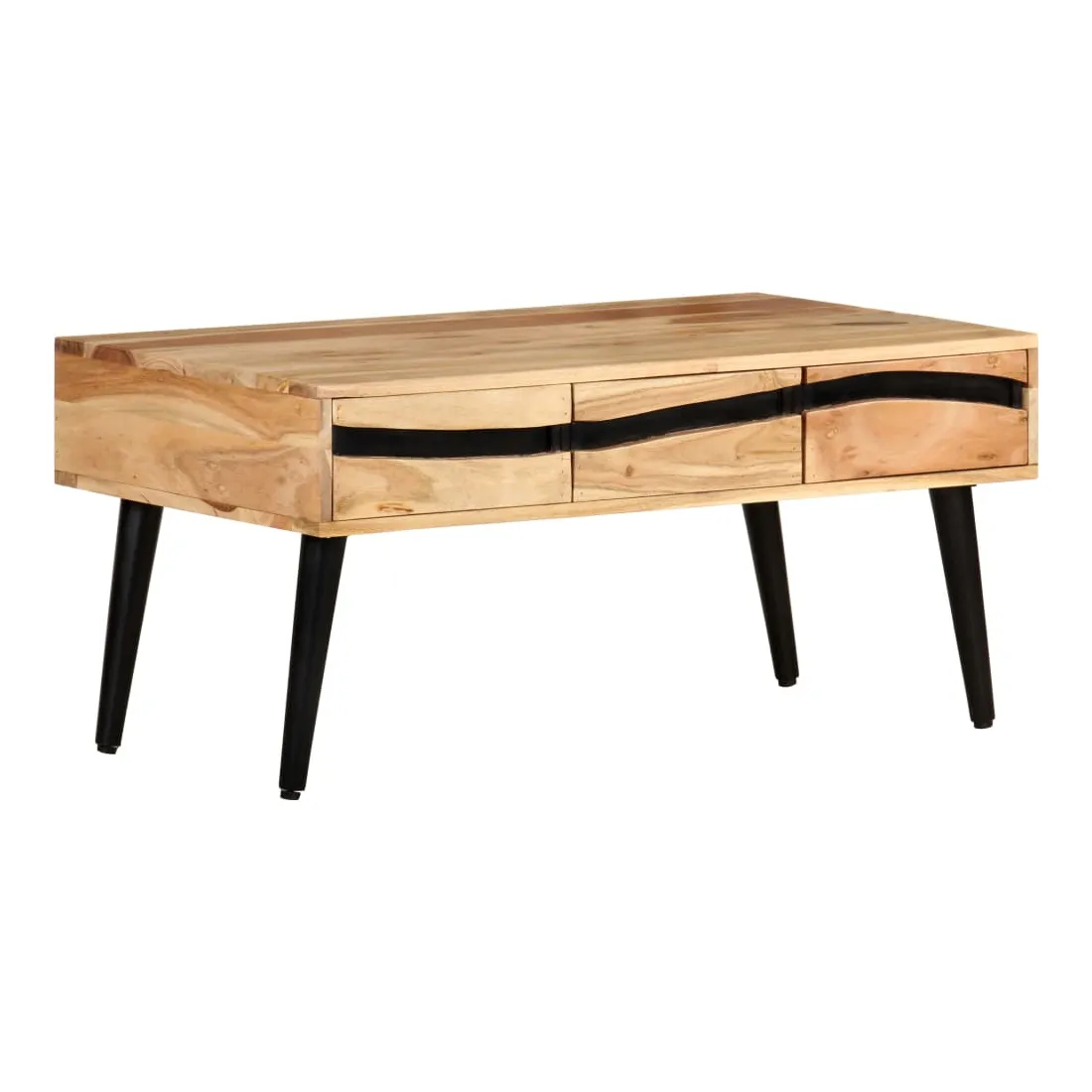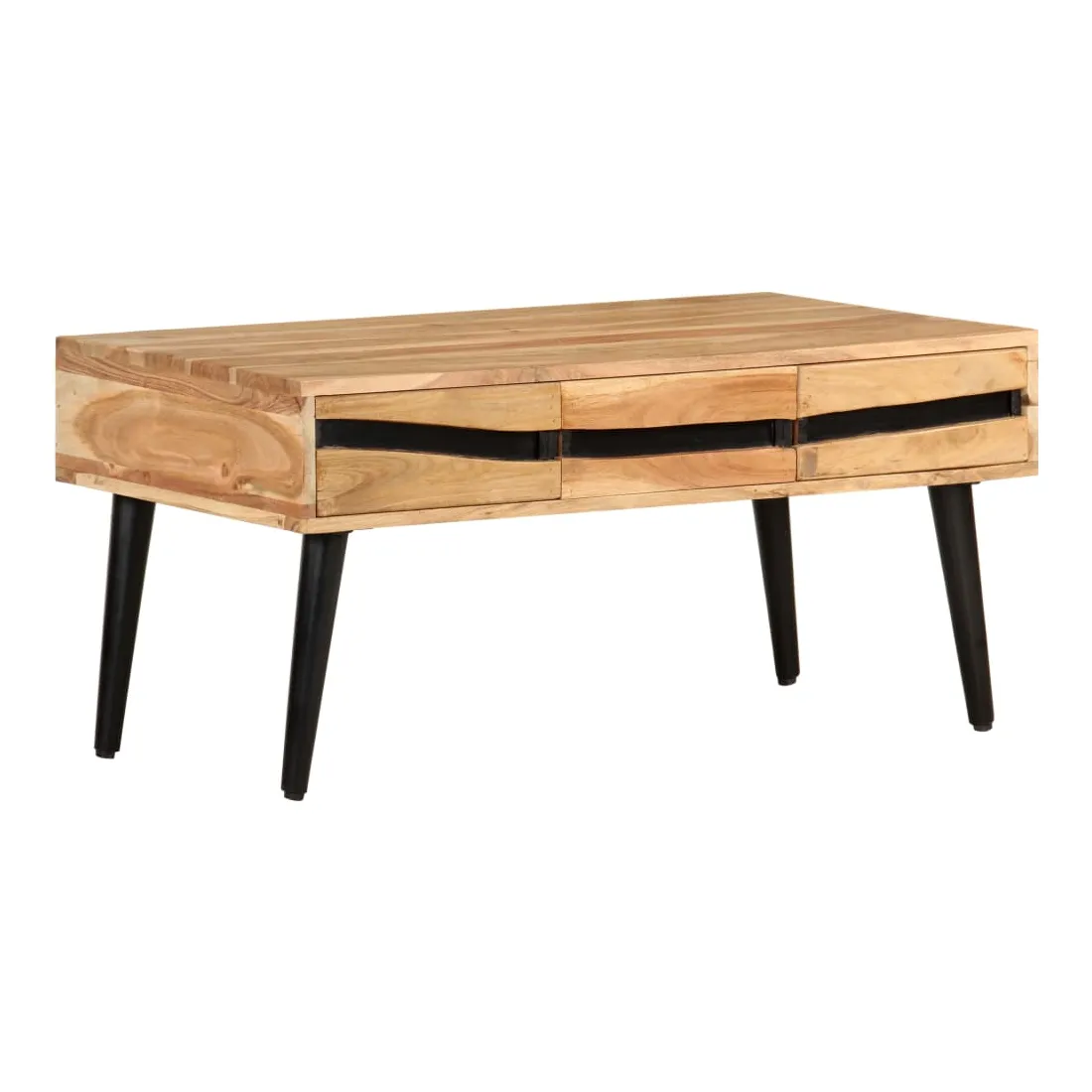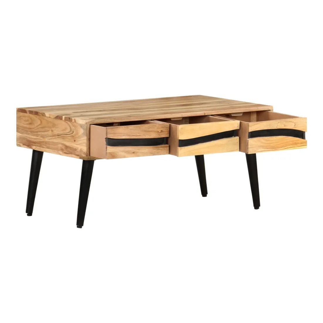 Détendez-vous et profitez du beau temps avec la famille et les amis autour de cette table basse en bois ! La table centrale est fabriquée en bois d’acacia massif, un bois dur avec des grains denses. Cette table de canapé au design magnifique est durable et accrocheuse. De plus, l’artisanat exquis et les beaux grains de bois font chaque pièce légèrement différente l'une de l'autre. Les pieds en fer enduit de poudre ajoutent à sa robustesse. La table en bois dispose de 3 tiroirs avec un grand espace de rangement. Le dessus de table solide offre une surface stable et sécurisée pour vos différents essentiels. Remarque importante : les couleurs varient d'une pièce à l'autre, rendant chaque pièce unique. La livraison est aléatoire, garantissant l'exclusivité et l'individualité de votre produit.