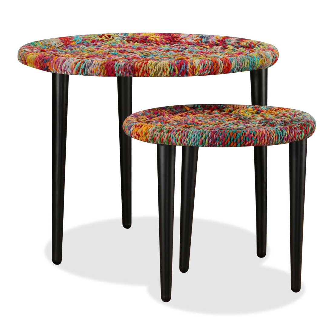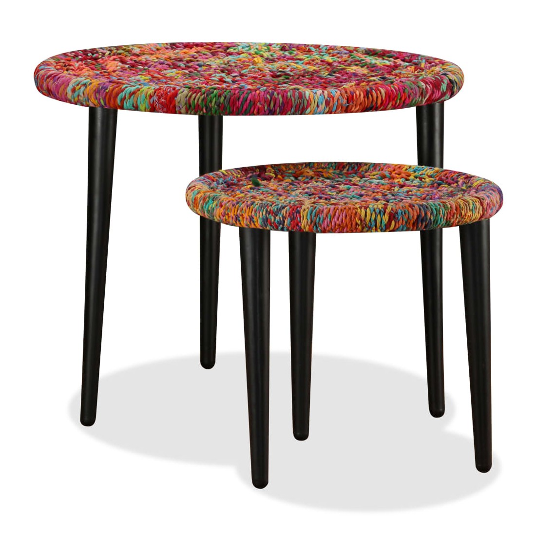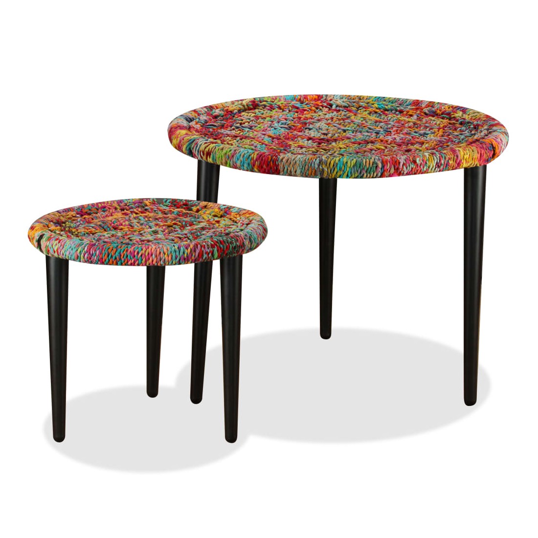 Ces 2 tables basses entièrement faites à la main avec des détails chindi magnifiques et colorés sera un ajout élégant à n'importe quel salon. Les tables gigognes sont élégantes et pratiques. Leur design exotique fera de ces tables basses le point central de tout espace de vie. Ces supports de table dégagent un charme naturel. Les dessus de table, sur lesquels vous pouvez placer des articles décoratifs comme des corbeilles de fruits, des vases ou des boissons et des casse-croûte, sont décorés avec des détails tissés colorés. Les jambes d'acier fort ajoutent à leur robustesse et stabilité. La livraison inclut deux tables basses. Remarque importante : les couleurs varient d'une pièce à l'autre, rendant chaque pièce unique ; la livraison est aléatoire.