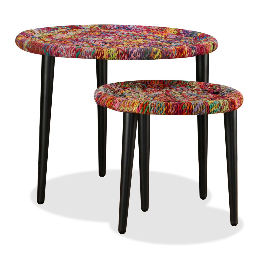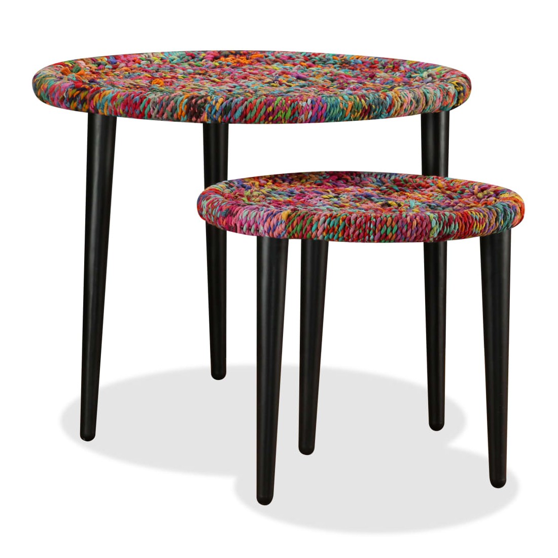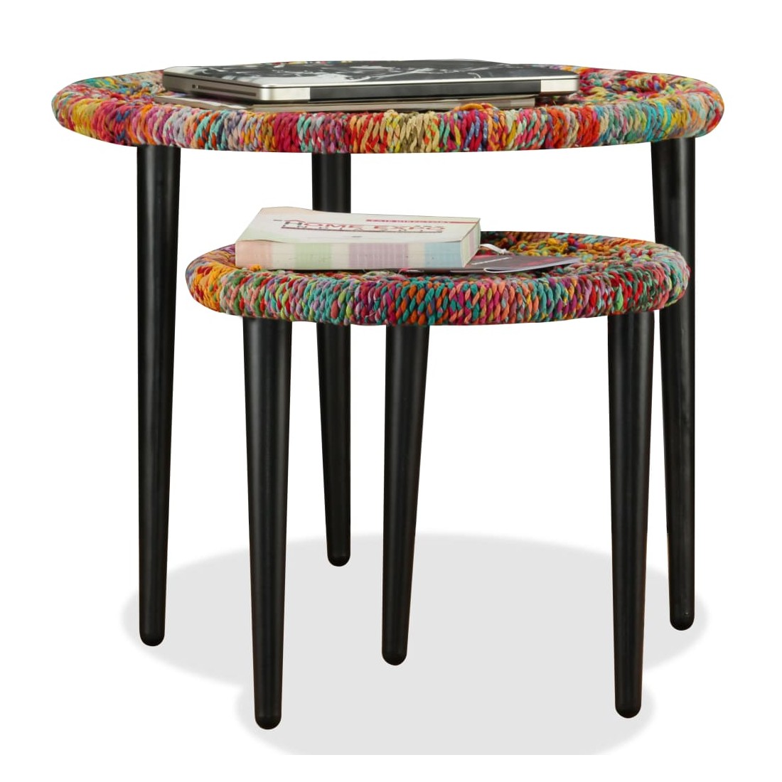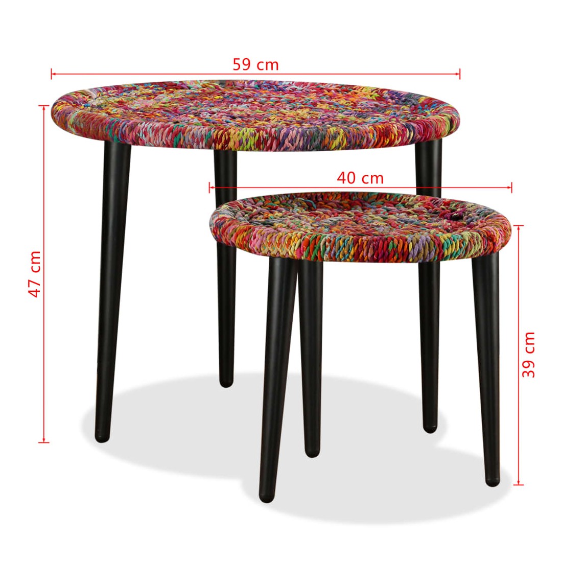 Ces 2 tables basses entièrement faites à la main avec des détails chindi magnifiques et colorés sera un ajout élégant à n'importe quel salon. Les tables gigognes sont élégantes et pratiques. Leur design exotique fera de ces tables basses le point central de tout espace de vie. Ces supports de table dégagent un charme naturel. Les dessus de table, sur lesquels vous pouvez placer des articles décoratifs comme des corbeilles de fruits, des vases ou des boissons et des casse-croûte, sont décorés avec des détails tissés colorés. Les jambes d'acier fort ajoutent à leur robustesse et stabilité. La livraison inclut deux tables basses. Remarque importante : les couleurs varient d'une pièce à l'autre, rendant chaque pièce unique ; la livraison est aléatoire.