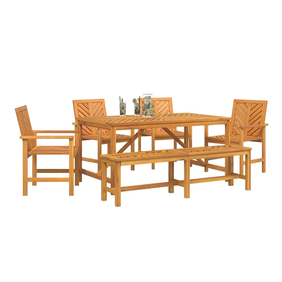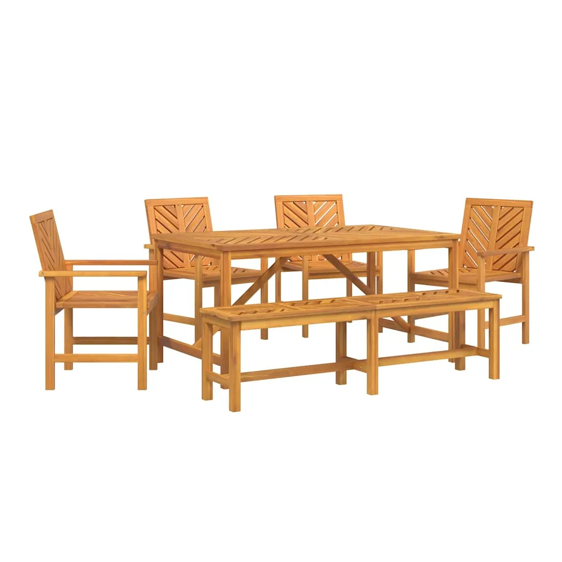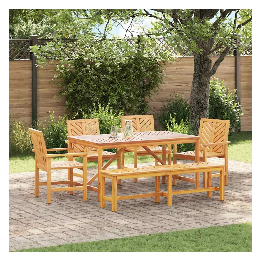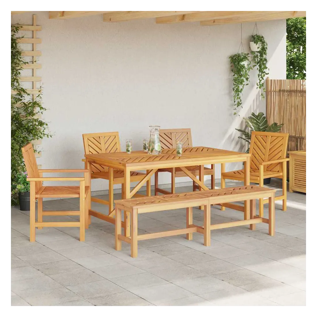 Ce set de repas de jardin moderne est un super choix pour manger dehors. Avec ses lignes simples et son style épuré, il crée une ambiance chic et classe dans votre jardin ou sur votre terrasse. Parfait pour rassembler la famille et les amis, il embellit tous les espaces extérieurs. Matériaux : Fabriqué en bois d'acacia massif, ce set a un look chaleureux et élégant grâce à son beau grain naturel. Ce bois est choisi pour sa solidité et son allure, s'intégrant parfaitement dans n'importe quel jardin. Composants inclus : Ce set est composé d'une table robuste et de chaises assorties, parfaites pour manger dehors. Chaque chaise a des pieds en acacia massif, avec accoudoirs et sièges, tous unis par une même couleur et matériau pour un look harmonieux. Caractéristiques : La forme rectangulaire classique s'adapte à toutes sortes d'aménagements extérieurs, offrant un grand espace pour partager des repas. La finition huilée protège contre l'humidité pour une longue durée de vie et peu d'entretien. Utilisations recommandées : Destiné uniquement à l'extérieur, ce set est idéal pour les jardins, terrasses et patios. Organisez-y des repas ou des brunchs décontractés grâce à sa capacité généreuse. Entretien et maintenance : Pour le garder en bon état, essuyez régulièrement avec un chiffon sec. Évitez de l'exposer aux intempéries quand vous ne l’utilisez pas. Une housse de protection par mauvais temps peut prolonger sa durée de vie.