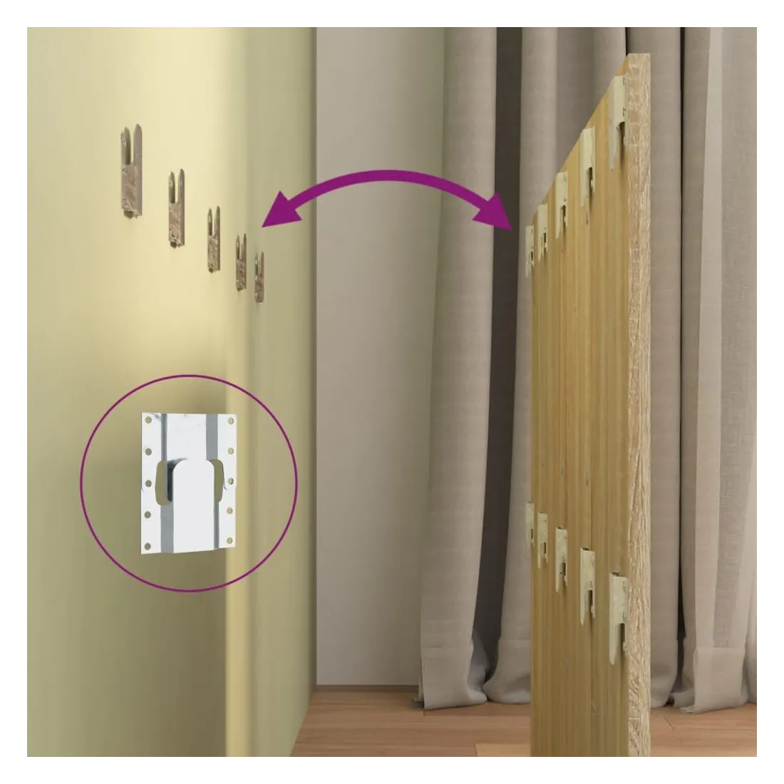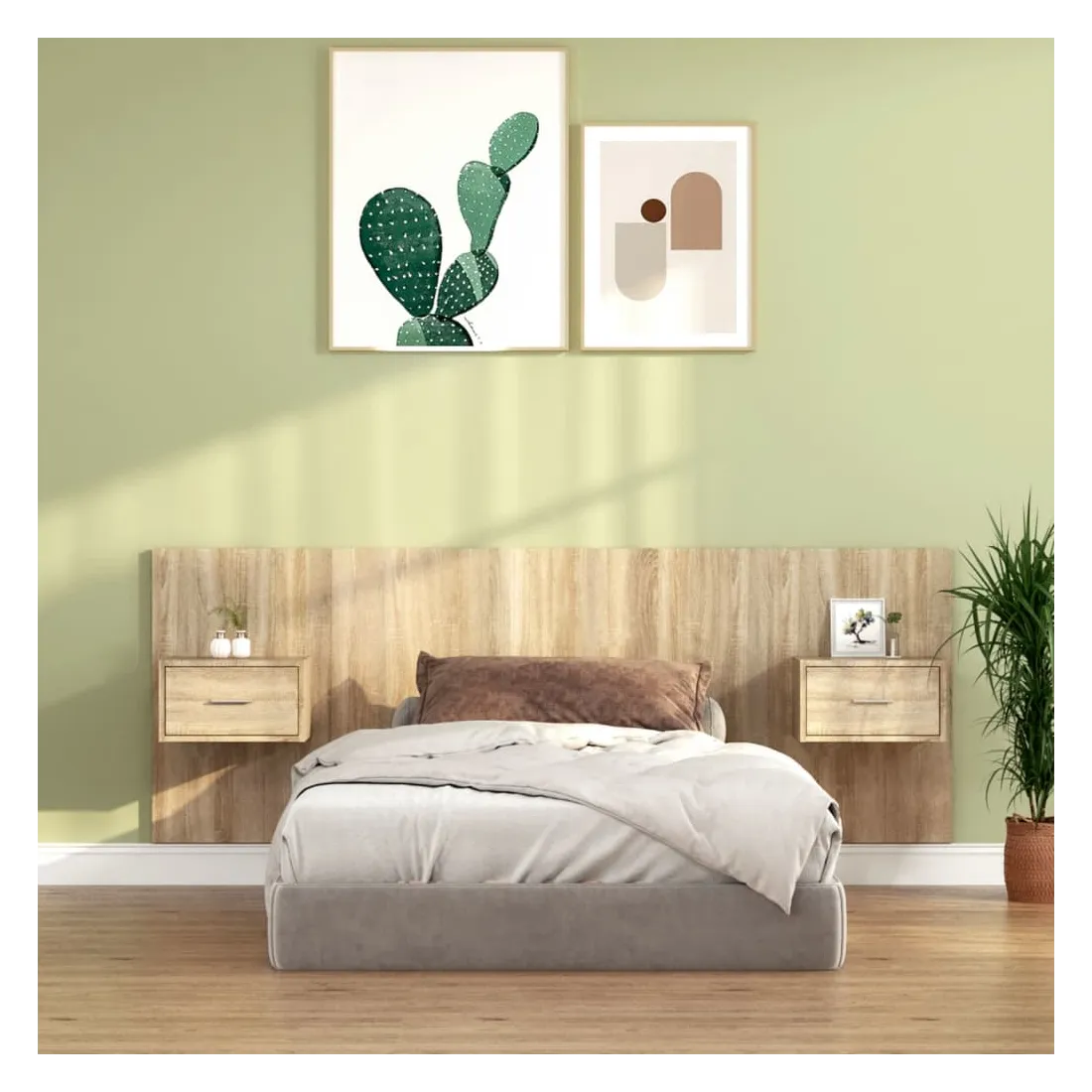 La tête de lit robuste avec armoires, au design classique, donne à votre cadre de lit un aspect complet et convient à toute chambre à coucher. Matériau robuste : le bois d'ingénierie est d'une qualité exceptionnelle avec une surface lisse et présente également résistance, stabilité et résistance à l'humidité.Design mural : les tables de chevet flottantes et la tête de lit peuvent être fixées au mur. De cette façon, vous pouvez maximiser votre espace au sol et garder la zone propre.Espace de rangement : l'unité de chevet dispose d'un espace de rangement spacieux qui vous permet de garder vos affaires organisées. ATTENTION :Les vis et les chevilles pour l'intérieur du mur ne sont pas incluses. Recherchez et utilisez des vis et des chevilles adaptées à vos murs. Si vous n'êtes pas sûr, demandez conseil à un professionnel. Lisez et suivez attentivement chaque étape des instructions.