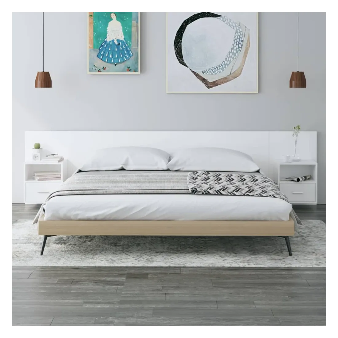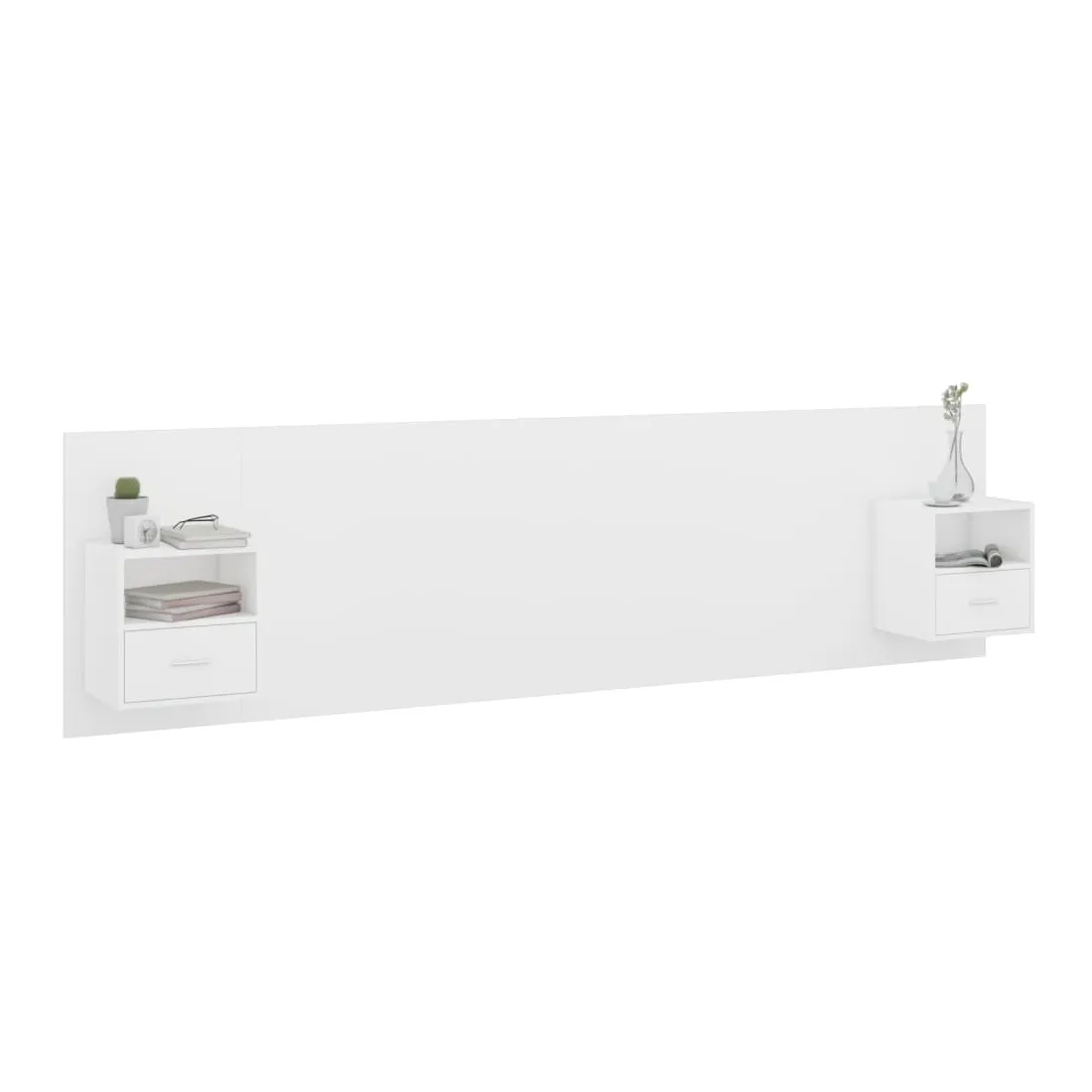 La tête de lit robuste avec armoires, au design classique, donne à votre cadre de lit un aspect complet et convient à toute chambre à coucher. Matériau robuste : le bois d'ingénierie est d'une qualité exceptionnelle avec une surface lisse et présente également résistance, stabilité et résistance à l'humidité.Design mural : les tables de chevet flottantes et la tête de lit peuvent être fixées au mur. De cette façon, vous pouvez maximiser votre espace au sol et garder la zone propre.Espace de rangement : l'unité de chevet dispose d'un espace de rangement spacieux qui vous permet de garder vos affaires organisées. ATTENTION :Les vis et les chevilles pour l'intérieur du mur ne sont pas incluses. Recherchez et utilisez des vis et des chevilles adaptées à vos murs. Si vous n'êtes pas sûr, demandez conseil à un professionnel. Lisez et suivez attentivement chaque étape des instructions.