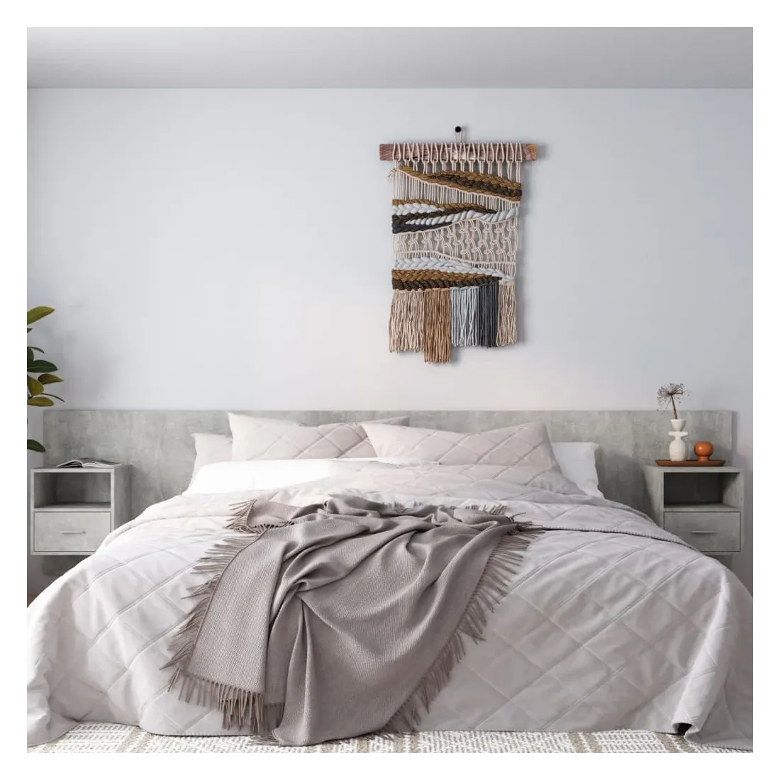 La tête de lit robuste avec armoires, au design classique, donne à votre cadre de lit un aspect complet et convient à toute chambre à coucher. Matériau robuste : le bois d'ingénierie est d'une qualité exceptionnelle avec une surface lisse et présente également résistance, stabilité et résistance à l'humidité.Design mural : les tables de chevet flottantes et la tête de lit peuvent être fixées au mur. De cette façon, vous pouvez maximiser votre espace au sol et garder la zone propre.Espace de rangement : l'unité de chevet dispose d'un espace de rangement spacieux qui vous permet de garder vos affaires organisées. ATTENTION :Les vis et les chevilles pour l'intérieur du mur ne sont pas incluses. Recherchez et utilisez des vis et des chevilles adaptées à vos murs. Si vous n'êtes pas sûr, demandez conseil à un professionnel. Lisez et suivez attentivement chaque étape des instructions.