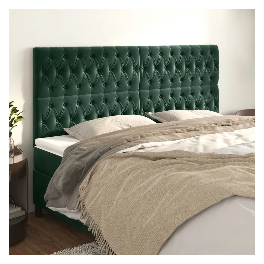 Cette tête de lit classique au design élégant complète parfaitement votre cadre de lit et s'adapte à toutes les chambres. Velours doux : Le velours est un tissu doux et luxueux qui se distingue par ses fibres denses et uniformément coupées et lisses. Le velours offre un toucher doux et agréable.Pieds robustes et stables : Les pieds en bois assurent robustesse et stabilité.Hauteur réglable : La tête de lit est réglable en hauteur selon vos préférences.Excellent soutien : La tête de lit vous offre un excellent soutien dorsal lorsque vous êtes assis dans votre lit pour lire ou regarder la télévision. Remarque :La livraison comprend uniquement la tête de lit. Le cadre de lit et le matelas ne sont pas inclus. Vous pouvez consulter notre boutique pour les cadres et matelas assortis.Chaque produit est livré avec un manuel de montage dans la boîte pour un assemblage facile.