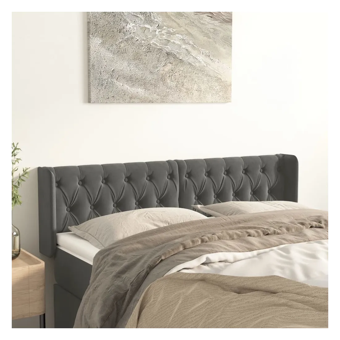 Cette tête de lit avec oreilles classique au design élégant donne à votre cadre de lit un aspect complet et convient à toute chambre à coucher. Velours doux : le velours est un tissu doux et luxueux qui se reconnaît à son tas dense de fibres uniformément coupées qui ont une touche lisse. Le tissu en velours présente un toucher doux distinctif, ce qui le rend confortable au toucher.Pieds robustes et stables : les pieds en bois assurent la robustesse et la stabilité.Hauteur réglable : la tête de lit est réglable en hauteur selon vos préférences.Excellent soutien : la tête de lit vous offre un excellent soutien du dos lorsque vous êtes assis dans votre lit pour lire ou regarder la télévision. Remarque :La livraison comprend uniquement la tête de lit. Le cadre de lit et le matelas ne sont pas inclus. Vous pouvez consulter notre boutique pour les cadres et matelas assortis.Chaque produit est livré avec un manuel de montage dans la boîte pour un montage facile.