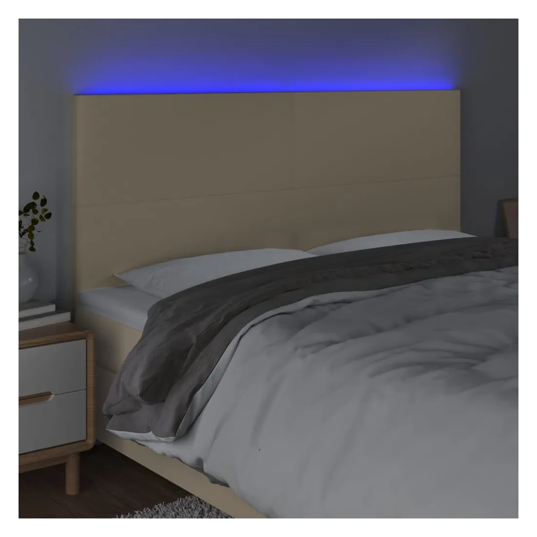 Cette tête de lit à LED classique, au design élégant, donne à votre cadre de lit une touche de modernité étonnante et convient parfaitement à toute chambre à coucher. Tissu durable : le tissu présente un aspect simple et épuré, et il est respirant et durable. LED colorée : apportez de l'éclairage dans l'obscurité avec des lumières LED colorées ! Hauteur réglable : la tête de lit est réglable en hauteur selon vos préférences. Excellent soutien : la tête de lit vous offre un excellent soutien du dos lorsque vous êtes assis dans votre lit pour lire ou regarder la télévision. Bande à LED découpable : cette bande à LED flexible peut être ajustée en longueur. Le symbole des ciseaux indique où la bande peut être coupée en toute sécurité sans l'endommager. Remarque : Seule la partie avec un sy