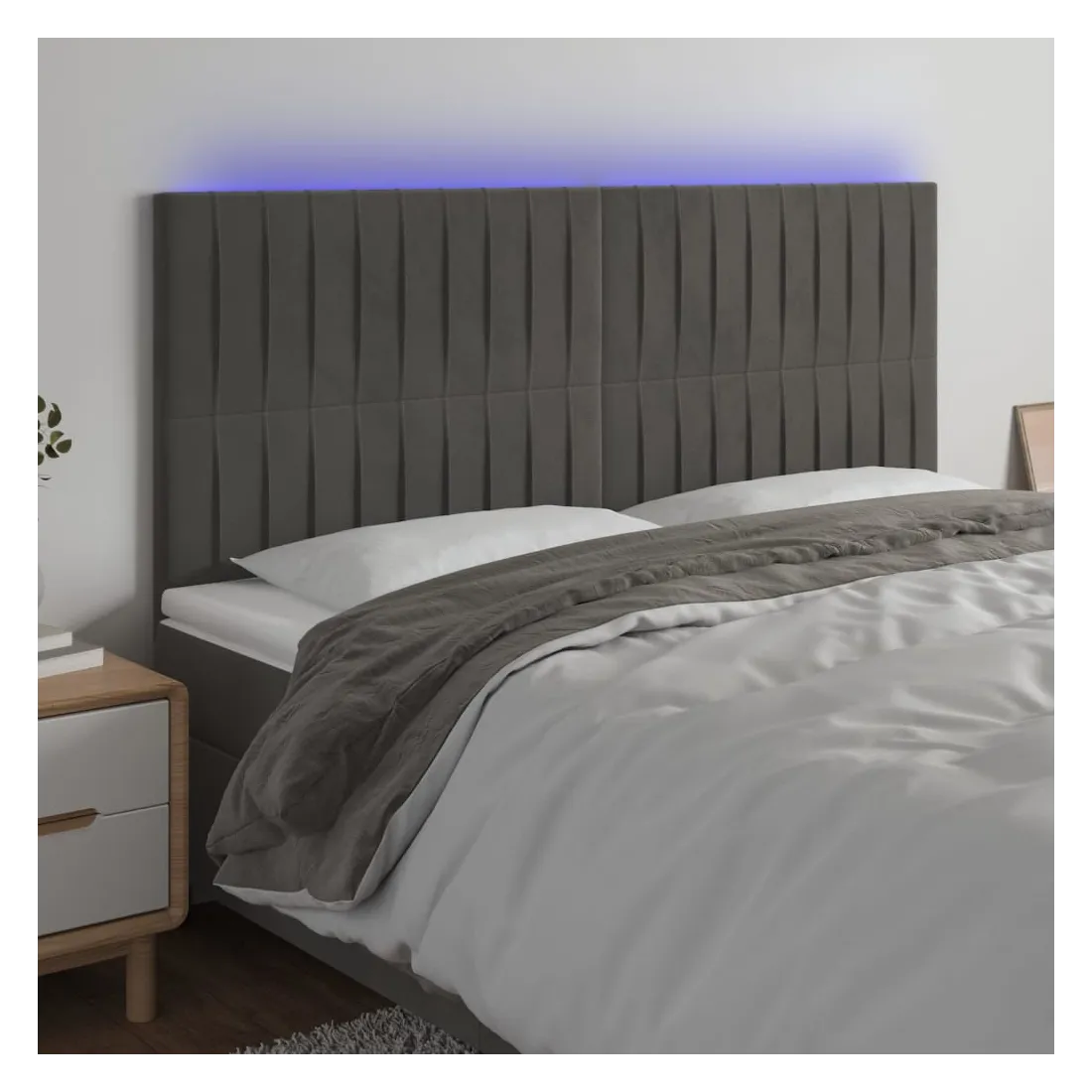 Cette tête de lit à LED classique, au design élégant, donne à votre cadre de lit une touche de modernité étonnante et convient parfaitement à toute chambre à coucher. Velours doux : le velours est un tissu doux et luxueux qui se reconnaît à son tas dense de fibres uniformément coupées qui ont une touche lisse. Le tissu en velours présente un toucher doux distinctif, ce qui le rend confortable au toucher.LED colorée : apportez de l'éclairage dans l'obscurité avec des lumières LED colorées !Hauteur réglable : la tête de lit est réglable en hauteur selon vos préférences.Excellent soutien : la tête de lit vous offre un excellent soutien du dos lorsque vous êtes assis dans votre lit pour lire ou regarder la télévision.Bande à LED découpable : cette bande à LED flexible peut être ajustée en longueur. Le symbole des ciseaux indique où la bande peut être coupée en toute sécurité sans l'endommager. Remarque :Seule la partie avec un symbole de ciseaux peut être coupée et seule la partie avec l'USB continuera à fonctionner comme avant.Chaque produit est livré avec un manuel de montage dans la boîte pour un montage facile.Ce produit est doté d'un connecteur USB, mais la source d'alimentation certifiée de USB 5V n'est pas incluse.