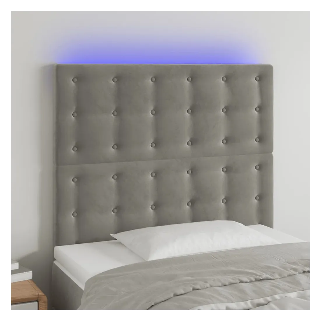 Cette tête de lit à LED classique, au design élégant, donne à votre cadre de lit une touche de modernité étonnante et convient parfaitement à toute chambre à coucher. Velours doux : le velours est un tissu doux et luxueux qui se reconnaît à son tas dense de fibres uniformément coupées qui ont une touche lisse. Le tissu en velours présente un toucher doux distinctif, ce qui le rend confortable au toucher.LED colorée : apportez de l'éclairage dans l'obscurité avec des lumières LED colorées !Hauteur réglable : la tête de lit est réglable en hauteur selon vos préférences.Excellent soutien : la tête de lit vous offre un excellent soutien du dos lorsque vous êtes assis dans votre lit pour lire ou regarder la télévision.Bande à LED découpable : cette bande à LED flexible peut être ajustée en longueur. Le symbole des ciseaux indique où la bande peut être coupée en toute sécurité sans l'endommager. Remarque :Seule la partie avec un symbole de ciseaux peut être coupée et seule la partie avec l'USB continuera à fonctionner comme avant.Chaque produit est livré avec un manuel de montage dans la boîte pour un montage facile.Ce produit est doté d'un connecteur USB, mais la source d'alimentation certifiée de USB 5V n'est pas incluse.