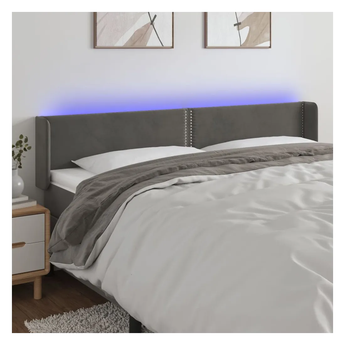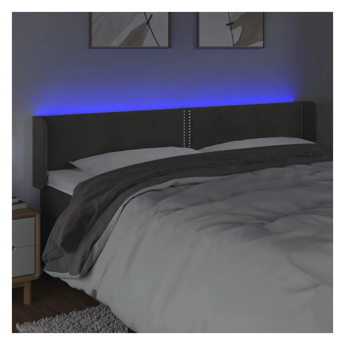 Cette tête de lit à LED classique, au design élégant, donne à votre cadre de lit une touche de modernité étonnante et convient parfaitement à toute chambre à coucher. Velours doux : le velours est un tissu doux et luxueux qui se reconnaît à son tas dense de fibres uniformément coupées qui ont une touche lisse. Le tissu en velours présente un toucher doux distinctif, ce qui le rend confortable au toucher.LED colorée : apportez de l'éclairage dans l'obscurité avec des lumières LED colorées !Hauteur réglable : la tête de lit est réglable en hauteur selon vos préférences.Excellent soutien : la tête de lit vous offre un excellent soutien du dos lorsque vous êtes assis dans votre lit pour lire ou regarder la télévision.Bande à LED découpable : cette bande à LED flexible peut être ajustée en longueur. Le symbole des ciseaux indique où la bande peut être coupée en toute sécurité sans l'endommager. Remarque :Seule la partie avec un symbole de ciseaux peut être coupée et seule la partie avec l'USB continuera à fonctionner comme avant.Chaque produit est livré avec un manuel de montage dans la boîte pour un montage facile.Ce produit est doté d'un connecteur USB, mais la source d'alimentation certifiée de USB 5V n'est pas incluse.