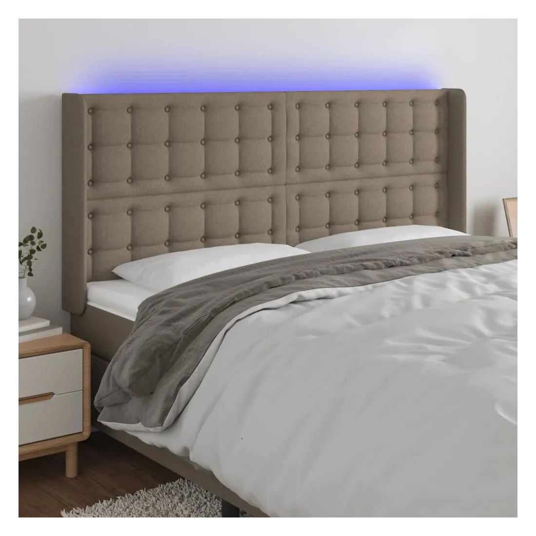 Cette tête de lit à LED classique, au design élégant, donne à votre cadre de lit une touche de modernité étonnante et convient parfaitement à toute chambre à coucher. Tissu durable : le tissu présente un aspect simple et épuré, et il est respirant et durable.LED colorée : apportez de l'éclairage dans l'obscurité avec des lumières LED colorées !Hauteur réglable : la tête de lit est réglable en hauteur selon vos préférences.Excellent soutien : la tête de lit vous offre un excellent soutien du dos lorsque vous êtes assis dans votre lit pour lire ou regarder la télévision.Bande à LED découpable : cette bande à LED flexible peut être ajustée en longueur. Le symbole des ciseaux indique où la bande peut être coupée en toute sécurité sans l'endommager. Remarque :Seule la partie avec un symbole de ciseaux peut être coupée et seule la partie avec l'USB continuera à fonctionner comme avant.Chaque produit est livré avec un manuel de montage dans la boîte pour un montage facile.Ce produit est doté d'un connecteur USB, mais la source d'alimentation certifiée de USB 5V n'est pas incluse.