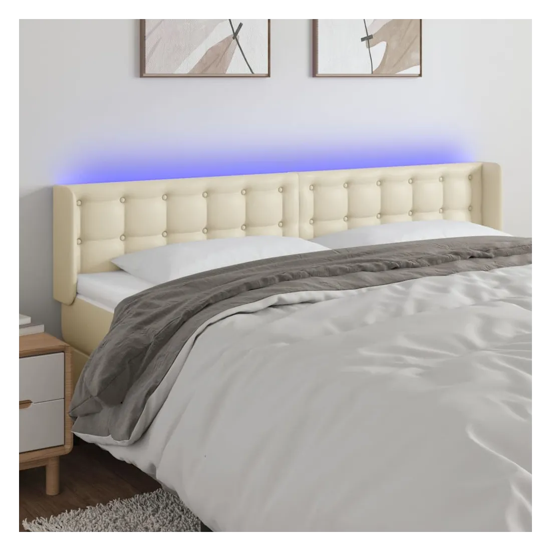 Cette tête de lit à LED classique, au design élégant, donne à votre cadre de lit une touche de modernité étonnante et convient parfaitement à toute chambre à coucher. Similicuir durable : le similicuir de qualité supérieure est un matériau très durable. Il est résistant aux taches, ce qui le rend facile à nettoyer avec un chiffon humide. La surface lisse donne également un aspect luxueux et la beauté du cuir véritable.LED colorée : apportez de l'éclairage dans l'obscurité avec des lumières LED colorées !Hauteur réglable : la tête de lit est réglable en hauteur selon vos préférences.Excellent soutien : la tête de lit vous offre un excellent soutien du dos lorsque vous êtes assis dans votre lit pour lire ou regarder la télévision.Bande à LED découpable : cette bande à LED flexible peut être ajustée en longueur. Le symbole des ciseaux indique où la bande peut être coupée en toute sécurité sans l'endommager. Remarque :Seule la partie avec un symbole de ciseaux peut être coupée et seule la partie avec l'USB continuera à fonctionner comme avant.Chaque produit est livré avec un manuel de montage dans la boîte pour un montage facile.Ce produit est doté d'un connecteur USB, mais la source d'alimentation certifiée de USB 5V n'est pas incluse.