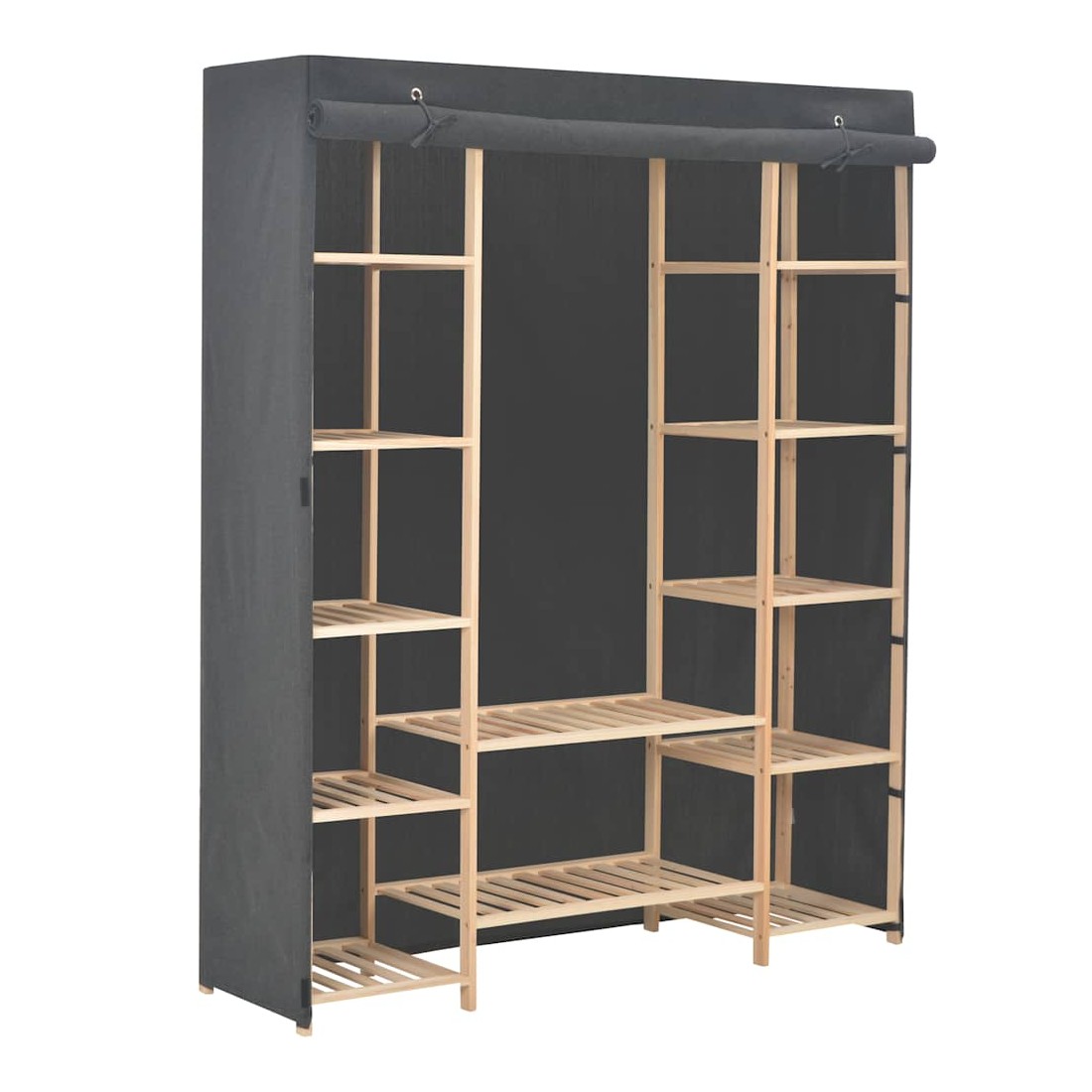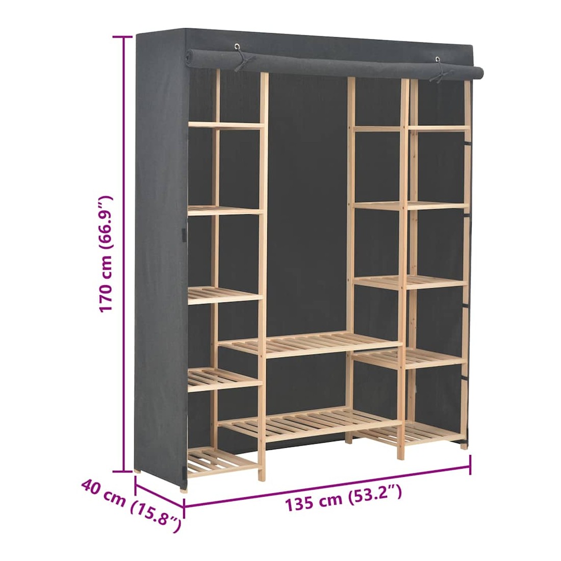Nos garde-robe fonctionnelle est non seulement une solution de rangement parfaite pour vos vêtements, chaussures, accessoires, elle constitue également un supplément décoratif unique à votre maison grâce à son design élégant et génial. La garde-robe présente une structure en bois durable, avec des multiples compartiments ouverts. La housse en tissu peut garder vos vêtements hors vue, les protégeant de la poussière en même temps. Notre garde-robe en tissu est facile à assembler.