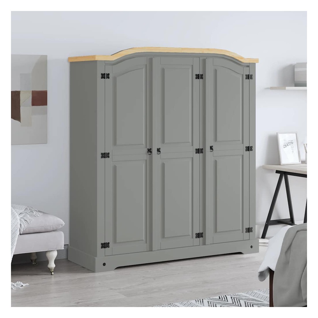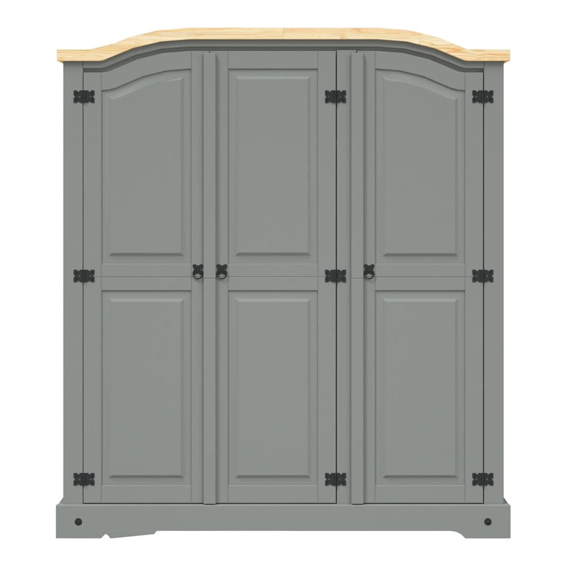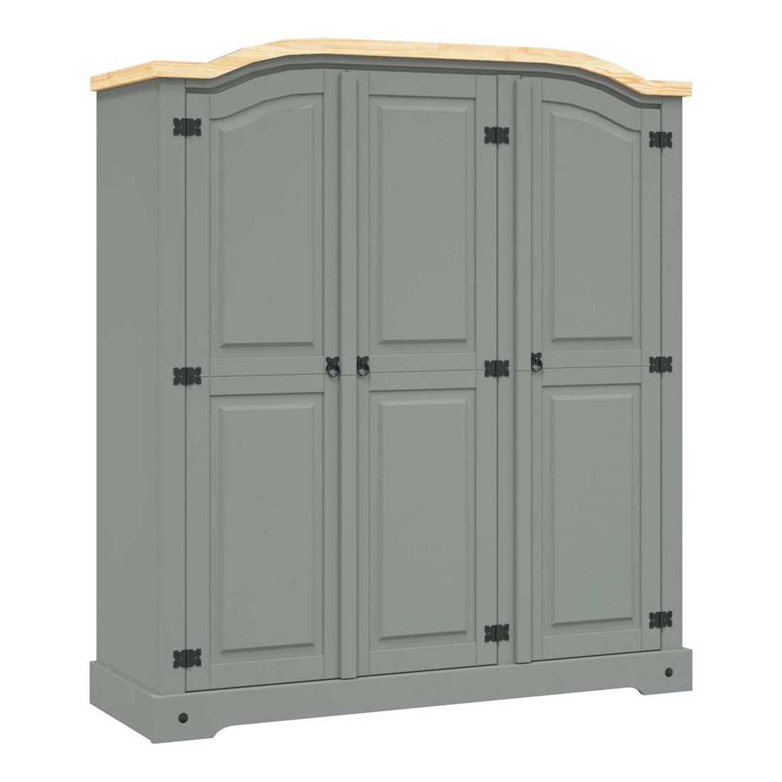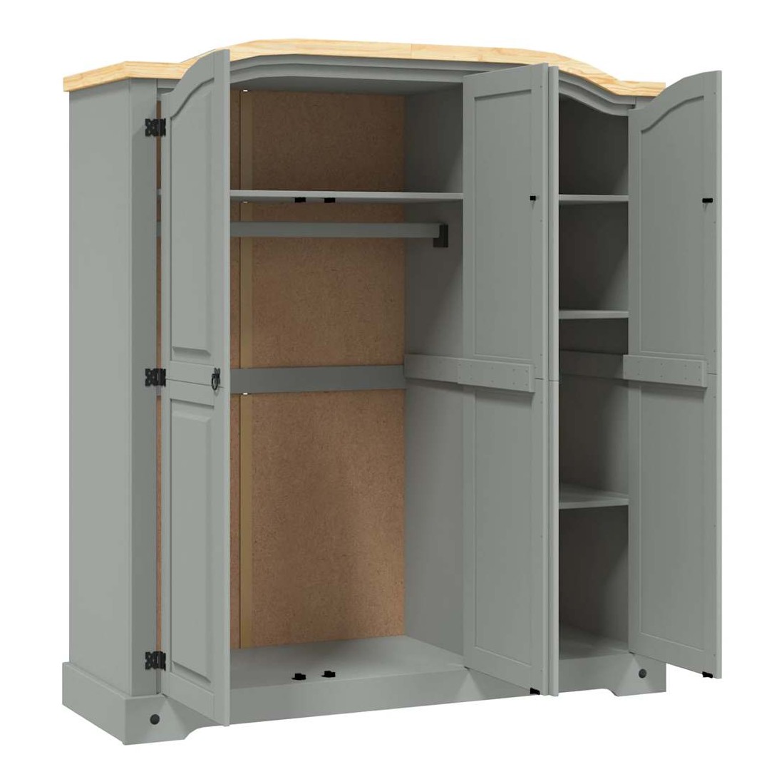 Cette garde-robe en bois de haute qualité est un meuble dans le style mexicain « Corona ». Le pin ciré avec des détails en métal noir dégage un charme mexicain rustique qui fera de la garde-robe un excellent supplément à votre chambre à coucher ou vestiaire. La garde-robe possède un magnifique design de dessus en forme de dôme et 3 portes. L’armoire solide et robuste est fabriquée à partir de bois de pin massif. Le grand compartiment à gauche est doté d'une étagère supérieure et d'une barre de penderie et offre beaucoup d'espace pour ranger vos vêtements. Le compartiment à droite comprend quatre étagères idéales pour ranger sous-vêtements, chaussettes, etc. L'assemblage est facile.
