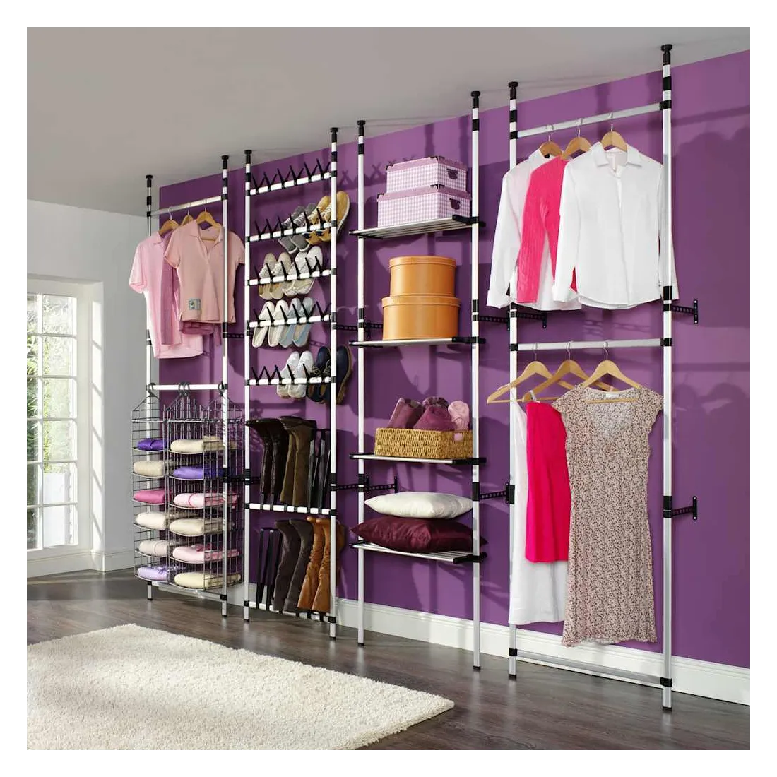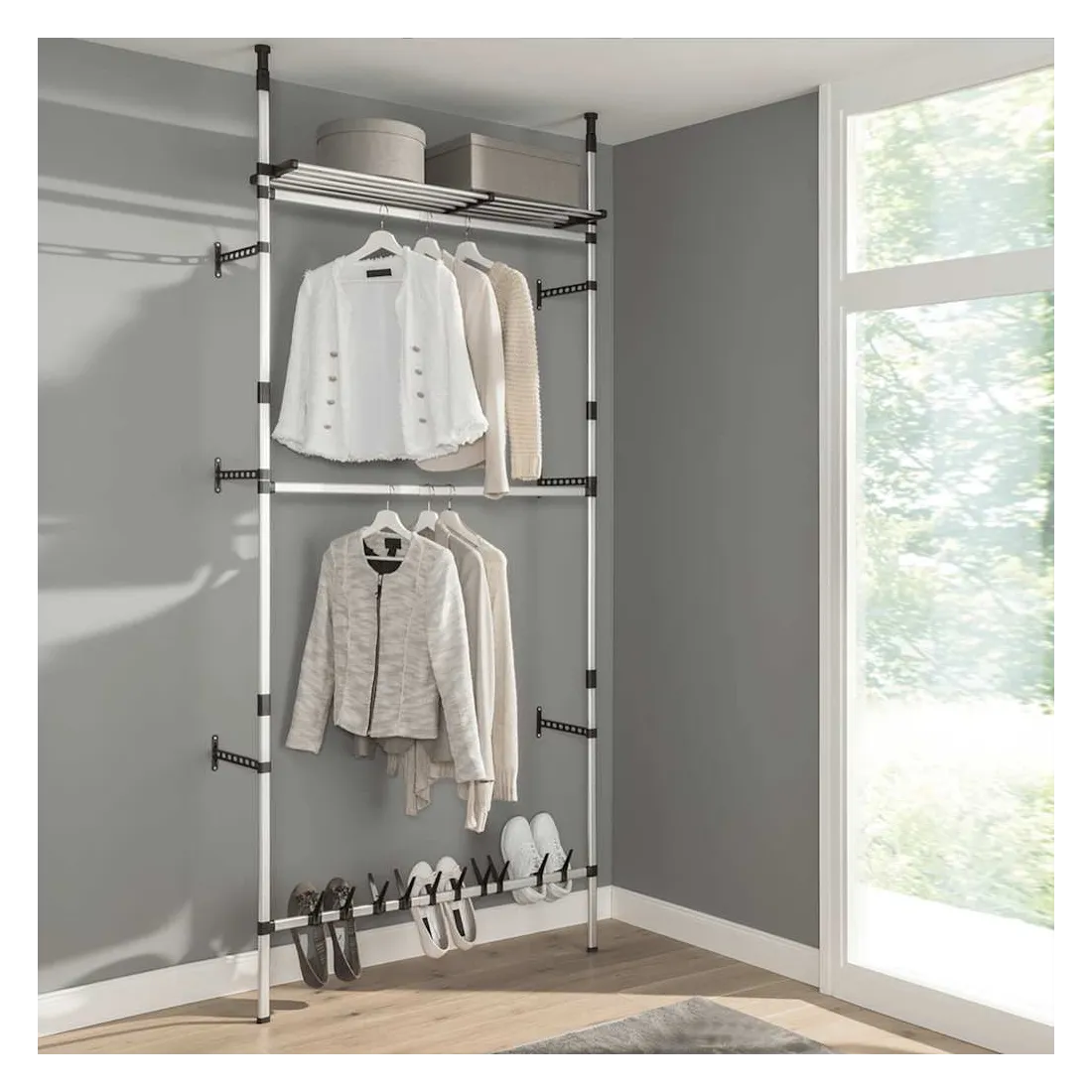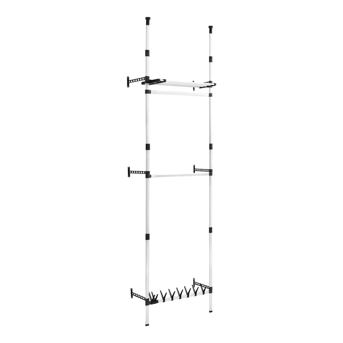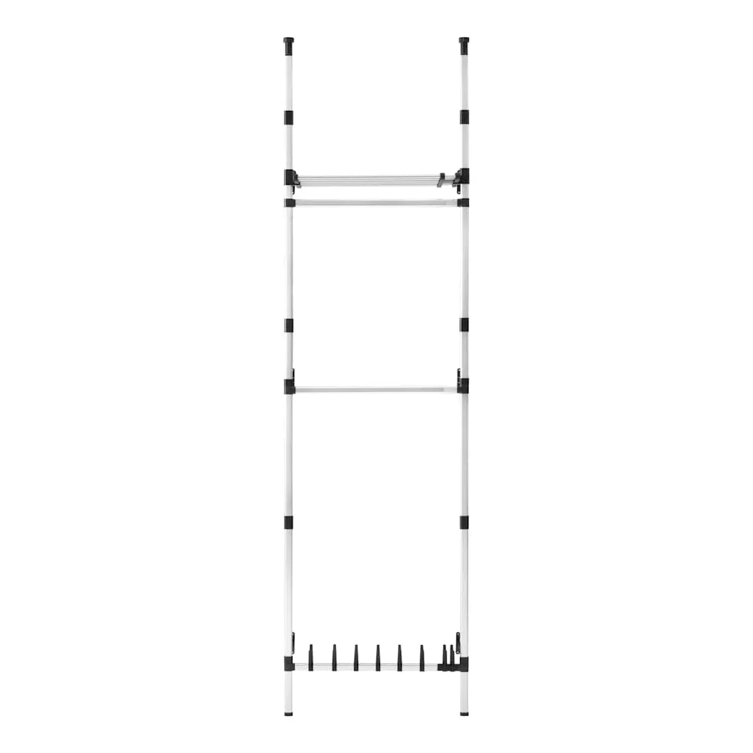 - Comprend 1 étagère réglable, 2 barres de penderie supérieures pour les vêtements et 1 barre inférieure pour 8 paires de chaussures