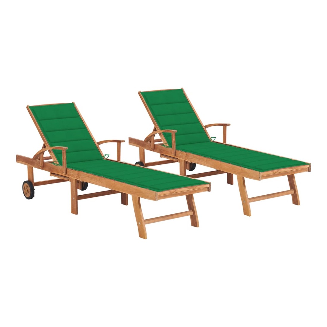 Chaises longues lot de 2 avec coussin vert Bois de teck solide