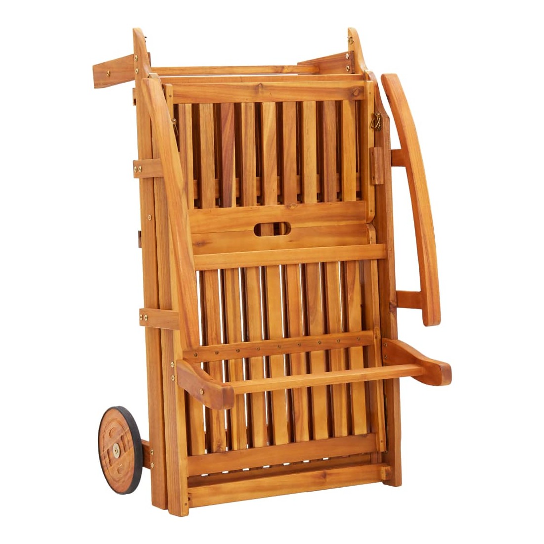 Cet ensemble de chaises longues en bois avec table, combine style et fonctionnalité et ajoutera une touche de charme rustique à votre jardin, patio, terrasse de piscine ou autre espace de vie extérieur. Construite en bois d’acacia massif, la chaise longue est résistante aux intempéries, durable et convient à un usage extérieur. Équipée de roues, elle peut être facilement déplacée. Le dossier et le repose-pied sont réglables de la position complètement verticale à la position complètement à plat, ce qui vous offre le plus grand confort. Le lit de jour et la table peuvent être repliés lorsqu'ils ne sont pas utilisés. Le coussin inclus est plus qu’un supplément pratique; il a également une fonction décorative. Remarque : afin de prolonger la durée de vie des meubles d'extérieur, nous vous recommandons de les protéger avec une housse imperméable.