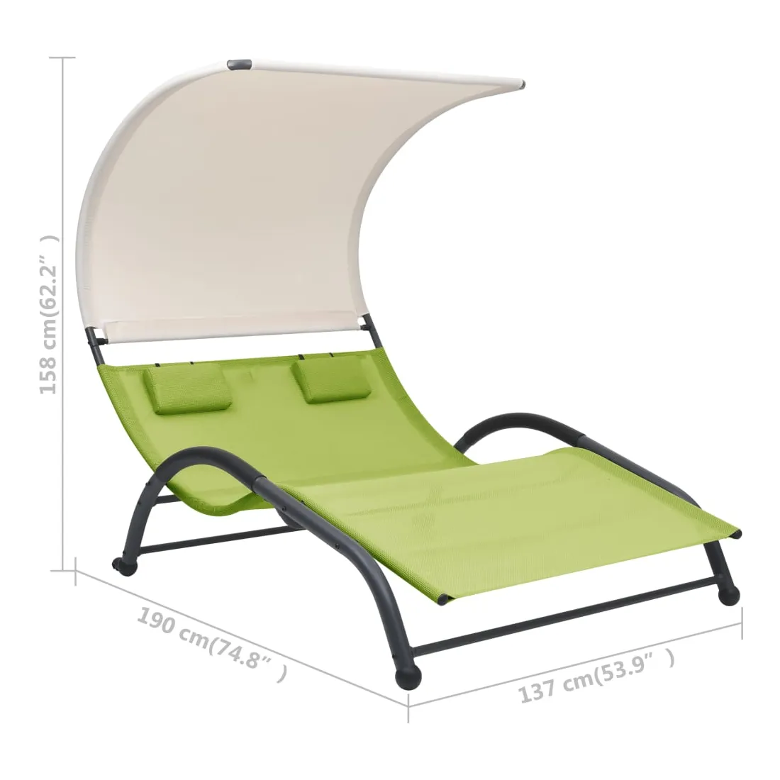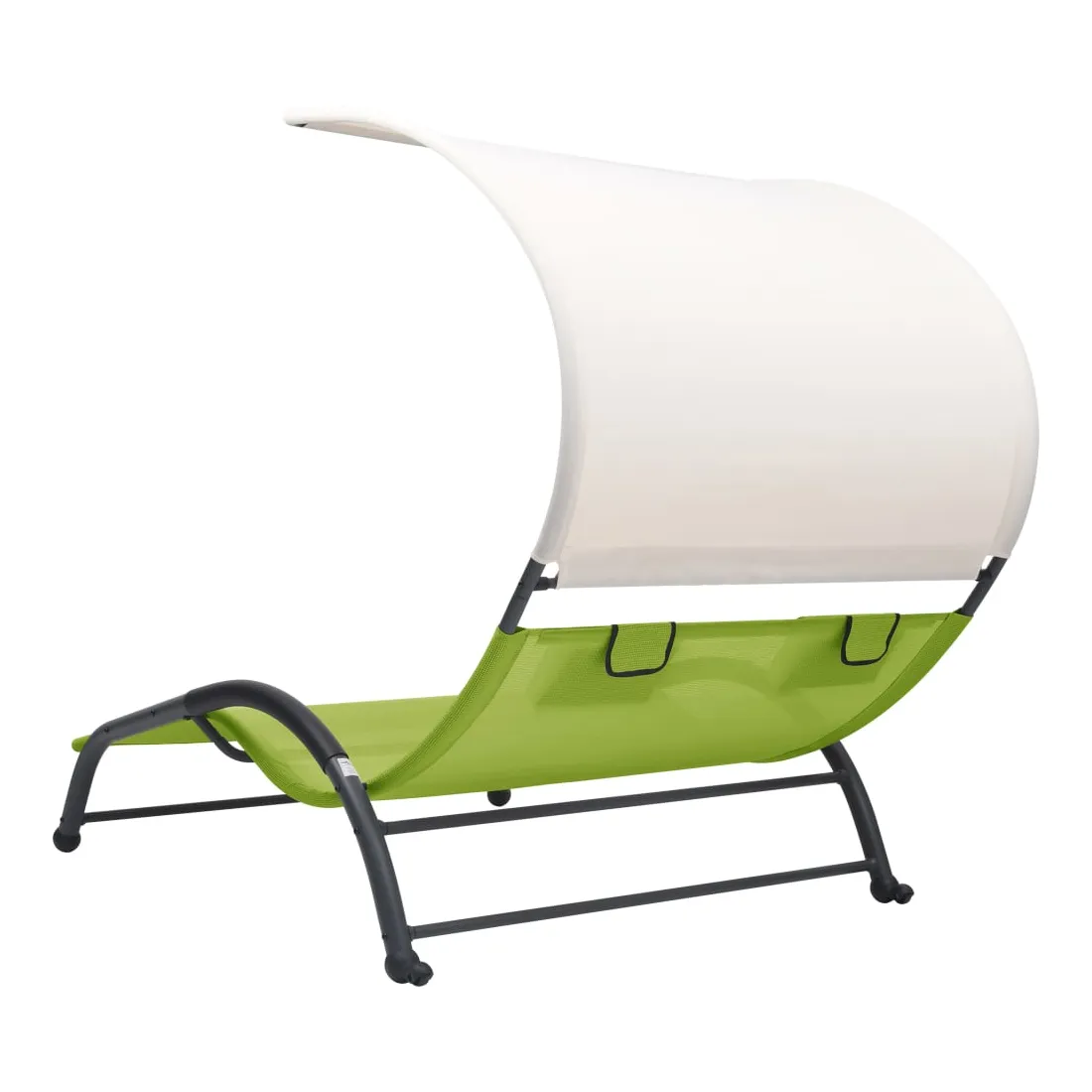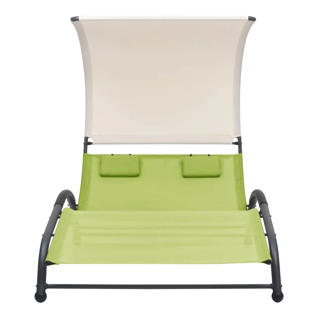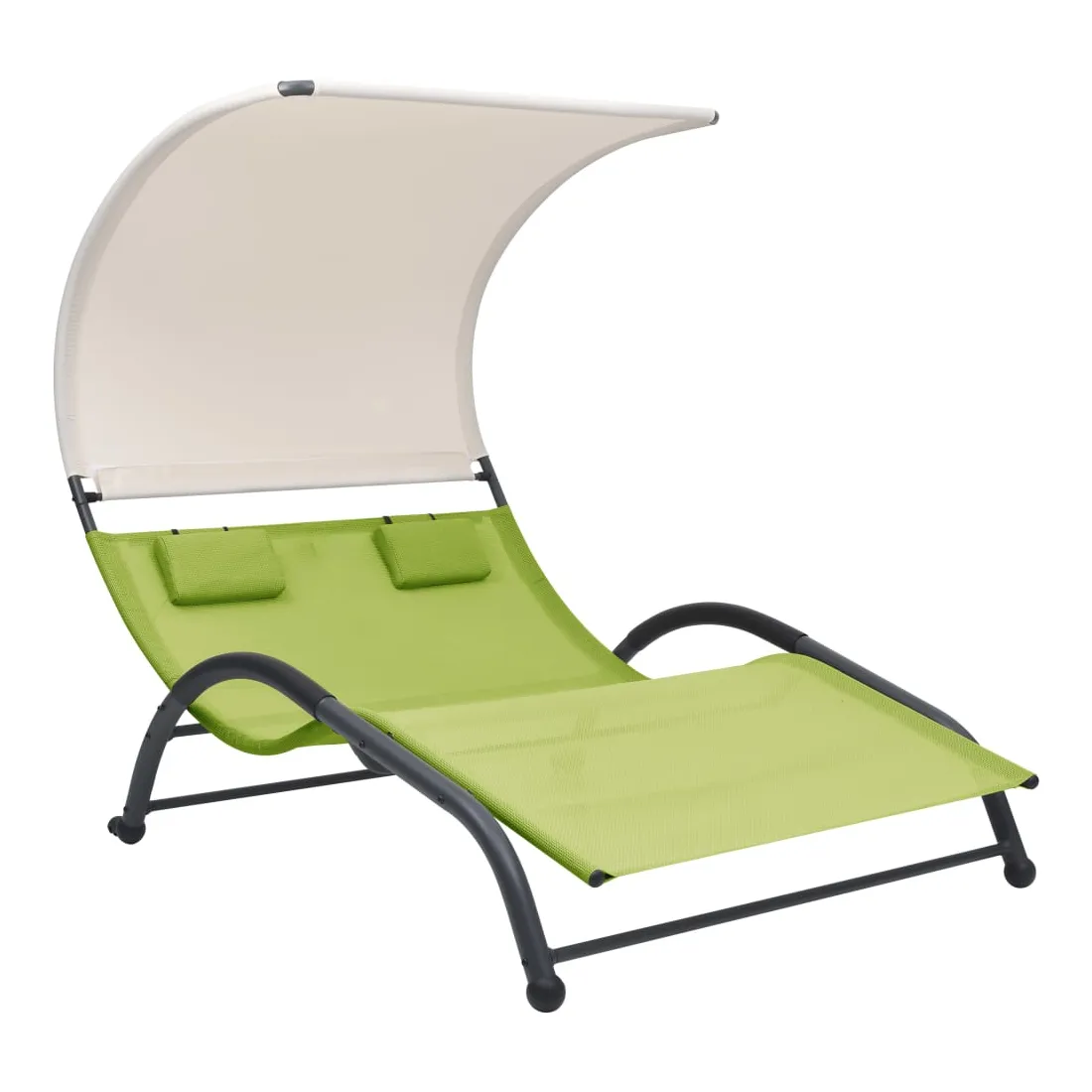 Que vous souhaitiez vous détendre seul ou en couple, cette chaise longue double est un excellent choix, idéale pour l’intérieur et l’extérieur. Ce transat dispose d’un cadre en acier robuste, qui apporte une super stabilité et assure une longue durée de vie de service. Le lit de repos est conçu avec un tissu textilène fort et respirant, offrant le confort suprême pendant votre temps de détente. Les deux petits oreillers inclus ajoutent un confort supplémentaire. De plus, l'auvent vous protège contre les rayons UV nocifs.