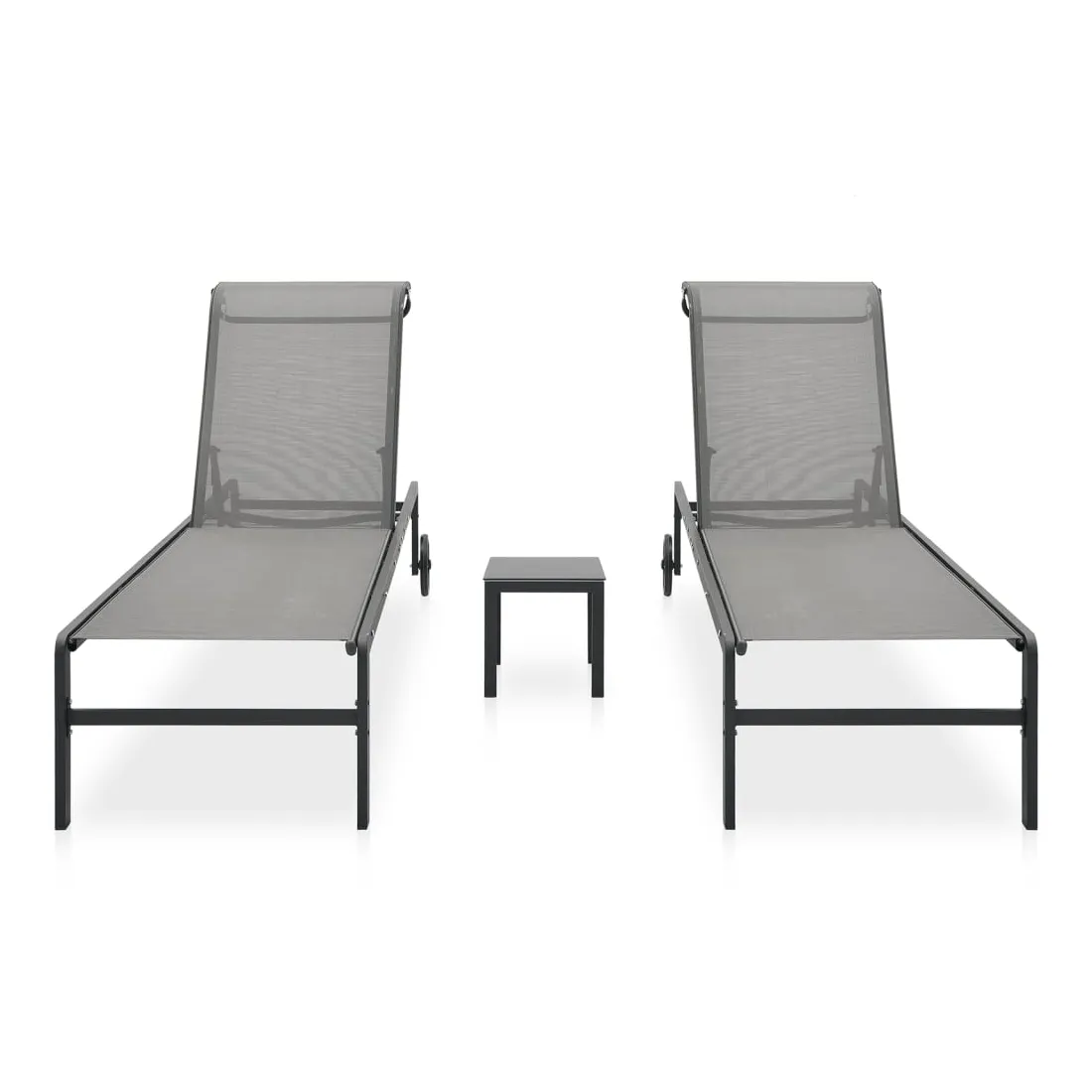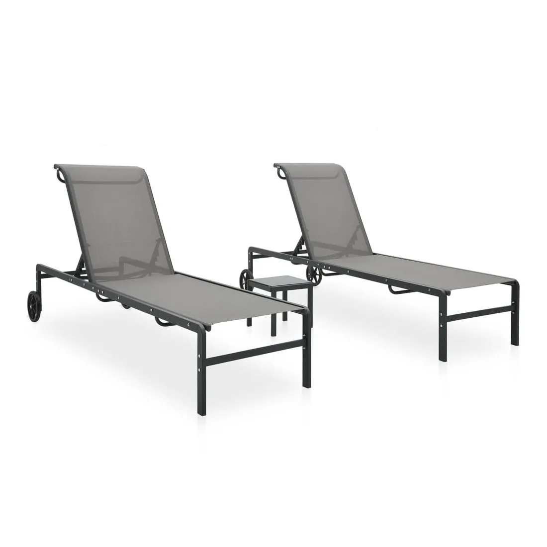Détendez-vous et profitez du plein air sur ces chaises longues confortables ! Matériau durable : la chaise longue et la table d'appoint sont dotées d'un cadre en acier robuste, ce qui les rend très stables, durables, légères et faciles à déplacer. L'assise et le dossier sont fabriqués en tissu textilène résistant, ce qui rend la chaise longue facile à nettoyer, résistante et adaptée à une utilisation quotidienne en plein air. Dossier réglable : le lit de repos est doté d'un dossier réglable qui vous permet de vous asseoir ou de vous allonger confortablement. Table pratique : vous pouvez garder vos portables, livres, collations ou boissons sur la table d'appoint, à portée de main, pendant vos temps de détente. Déplacement sans effort : les 2 roues vous permettent de déplacer facilement ce meuble de jardin à l'endroit souhaité. Nombreuses applications : cet ensemble de chaise longue, composé de 2 chaises longues et d'une table à thé, est parfait pour vous bronzer et vous détendre près de la piscine, sur la terrasse ou dans le jardin. Bon à savoir : La chaise longue ne convient qu'aux zones sèches avec protection contre la pluie. Pour que vos meubles d'extérieur restent beaux, nous vous recommandons de les protéger avec une housse imperméable.