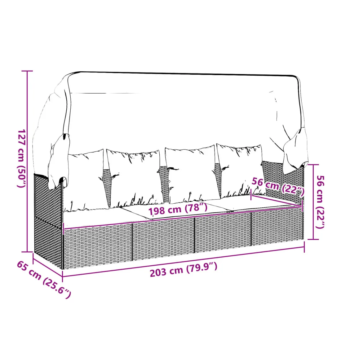 - Dimensions (lorsque le toit est ouvert) : 203 x 65 x 127 cm (l x P x H)