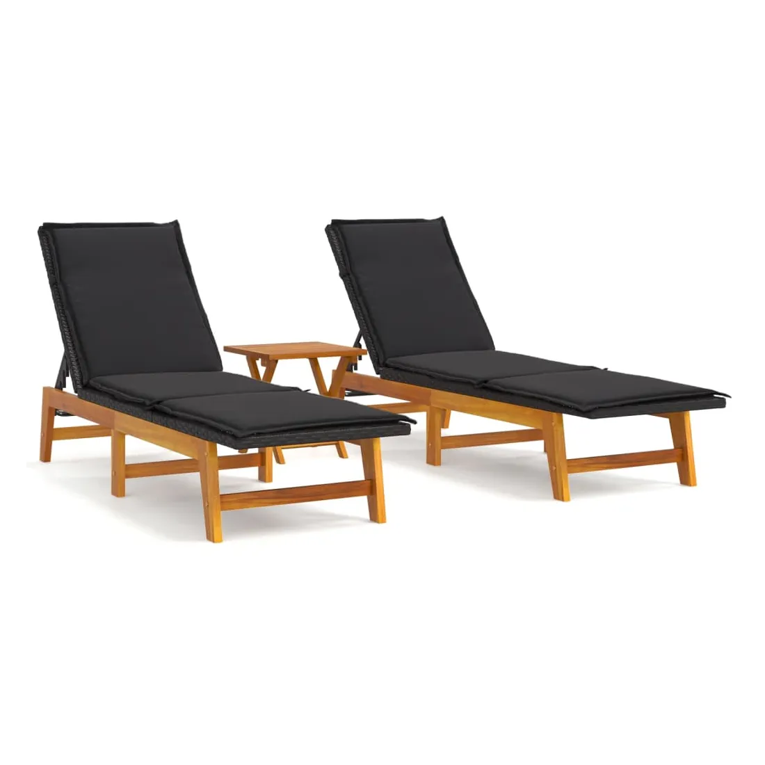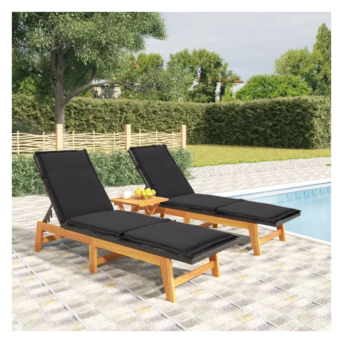 Ce salon de jardin, avec un design élégant et contemporain, sera un excellent choix pour vous détendre dans le jardin. Bois d'acacia massif : le bois d'acacia massif est un matériau naturel magnifique. Le bois d'acacia est un bois dur tropical, dense, robuste et durable. Par conséquent, le cadre de la chaise longue en bois d'acacia à finition à l'huile est stable et facile à entretenir.Matériau durable : la résine tressée, également connue sous le nom de rotin poly, résiste aux intempéries et est facile à nettoyer. Elle reste belle à l'extérieur pendant une longue période. Elle offre une excellente qualité, commodité et un aspect esthétique.Dossier réglable : la chaise longue confortable de cet ensemble de meubles de jardin a un dossier inclinable avec 4 positions pour une relaxation optimale.Confort supplémentaire : le coussin bien rembourré de l'ensemble de salon extérieur offre un confort ultime pendant votre temps de détente.Table pratique : le dessus robuste en bois d'acacia est parfait pour garder à portée de main votre téléphone, livre, collation ou boisson. Remarque :Pour que vos meubles d'extérieur restent beaux, nous vous recommandons de les protéger avec une housse imperméable. Bon à savoir :Pour faciliter au maximum le montage, chaque produit est livré avec des instructions.