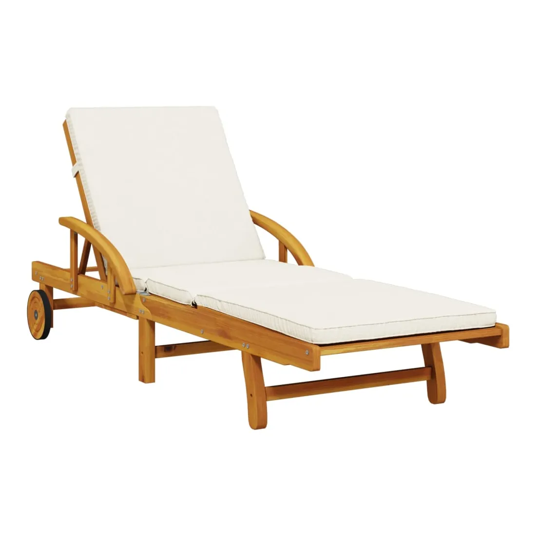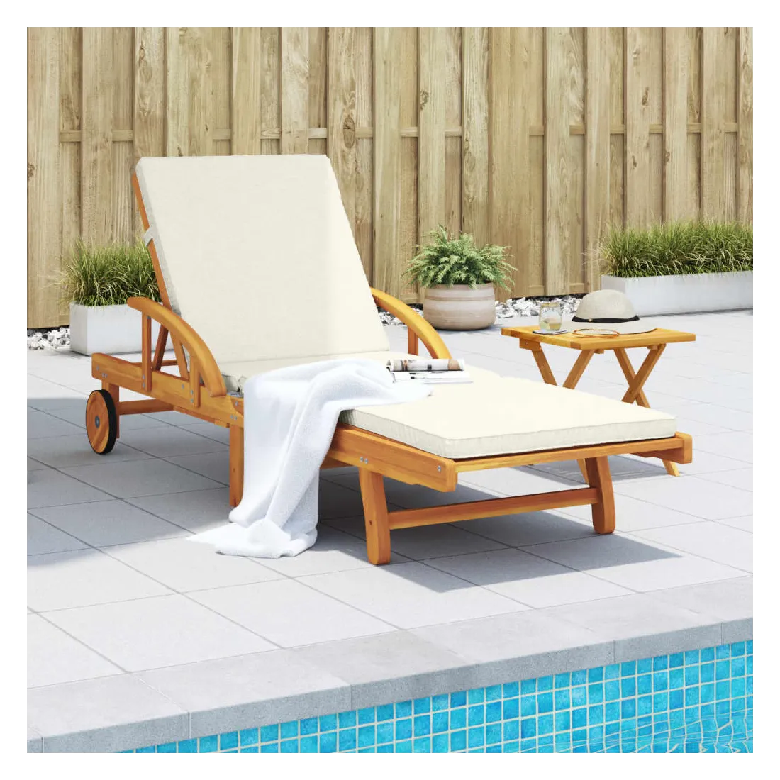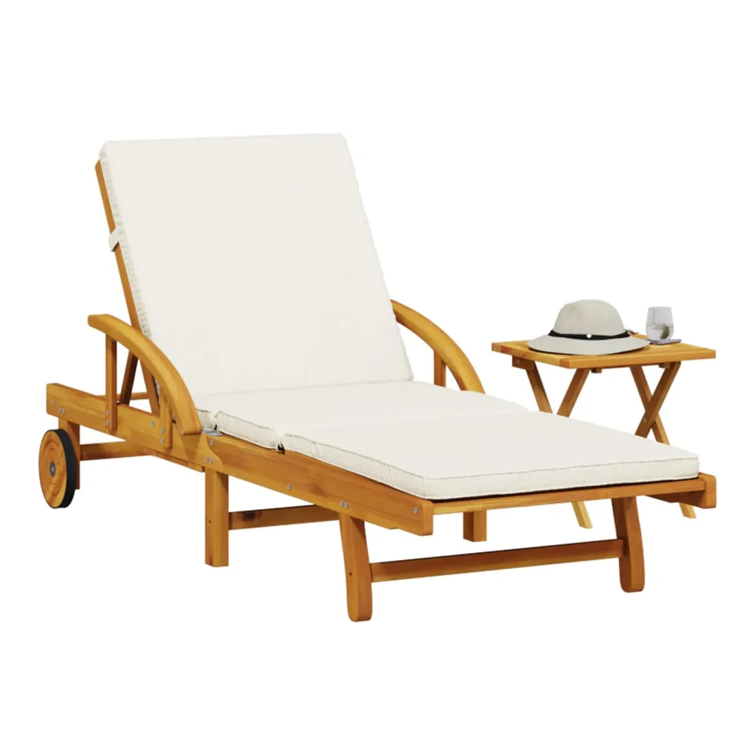 Détendez-vous et profitez du plein air avec cette chaise longue confortable ! Robuste et stable : le bois d'acacia massif est connu pour sa solidité et sa durabilité. Ses couleurs variées et ses grains uniques lui confèrent un aspect attrayant. Sa stabilité et sa résistance aux intempéries en font un matériau idéal pour la fabrication de meubles d'intérieur et d'extérieur.Fonction d'inclinaison manuelle : cette chaise inclinable est spécialement conçue avec 5 positions d'inclinaison afin que vous puissiez régler manuellement le dossier et le repose-pieds selon votre confort.Expérience d'assise confortable : ce mobilier d'extérieur, doté de coussins épais, offre une expérience d'assise confortable.Table coulissante pratique : ce mobilier d'extérieur est doté d'une table coulissante pratique, qui permet de ranger vos objets essentiels à portée de main.Bonne ventilation et prévention de l'accumulation d'eau : la conception à lattes favorise une circulation optimale de l'air et empêche efficacement l'accumulation d'eau, assurant ainsi une assise sèche et confortable.Housse amovible et lavable : ces coussins de siège sont dotés de housses amovibles pour un lavage et un entretien faciles.Design pliable : la table peut être facilement pliée lorsqu'elle n'est pas utilisée pour faciliter le rangement et le transport.Déplacement facile : vous pouvez déplacer la chaise longue d'extérieur facilement, grâce à son design léger et à ses roulettes. Bon à savoir :Pour que vos meubles d'extérieur restent beaux, nous vous recommandons de les protéger avec une housse imperméable.