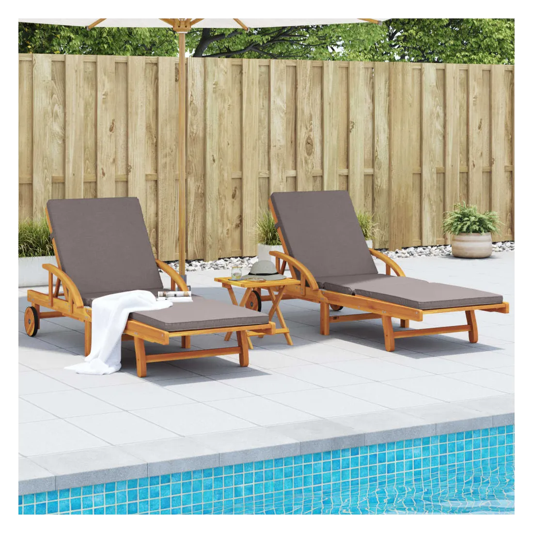 Détendez-vous et profitez du plein air avec ces chaises longues confortables ! Robuste et stable : le bois d'acacia massif est connu pour sa solidité et sa durabilité. Ses couleurs variées et ses grains uniques lui confèrent un aspect attrayant. Sa stabilité et sa résistance aux intempéries en font un matériau idéal pour la fabrication de meubles d'intérieur et d'extérieur.Fonction d'inclinaison manuelle : ce fauteuil inclinable est spécialement conçu avec 5 positions d'inclinaison afin que vous puissiez régler manuellement le dossier et le repose-pieds selon votre confort.Expérience d'assise confortable : ce mobilier d'extérieur, doté de coussins épais, offre une expérience d'assise confortable.Table coulissante pratique : ce mobilier d'extérieur est doté d'une table coulissante pratique, qui permet de ranger vos objets essentiels à portée de main.Bien ventilé et prévention de l'accumulation d'eau : la conception à lattes favorise une circulation optimale de l'air et empêche efficacement l'accumulation d'eau, assurant ainsi une assise sèche et confortable.Housse amovible et lavable : ces coussins de siège sont dotés de housses amovibles pour un lavage et un entretien faciles.Design pliable : la table peut être facilement pliée lorsqu'elle n'est pas utilisée pour faciliter le rangement et le transport.Déplacement facile : vous pouvez déplacer la chaise longue d'extérieur facilement, grâce à son design léger et à ses roulettes. Bon à savoir :Pour que vos meubles d'extérieur restent beaux, nous vous recommandons de les protéger avec une housse imperméable.