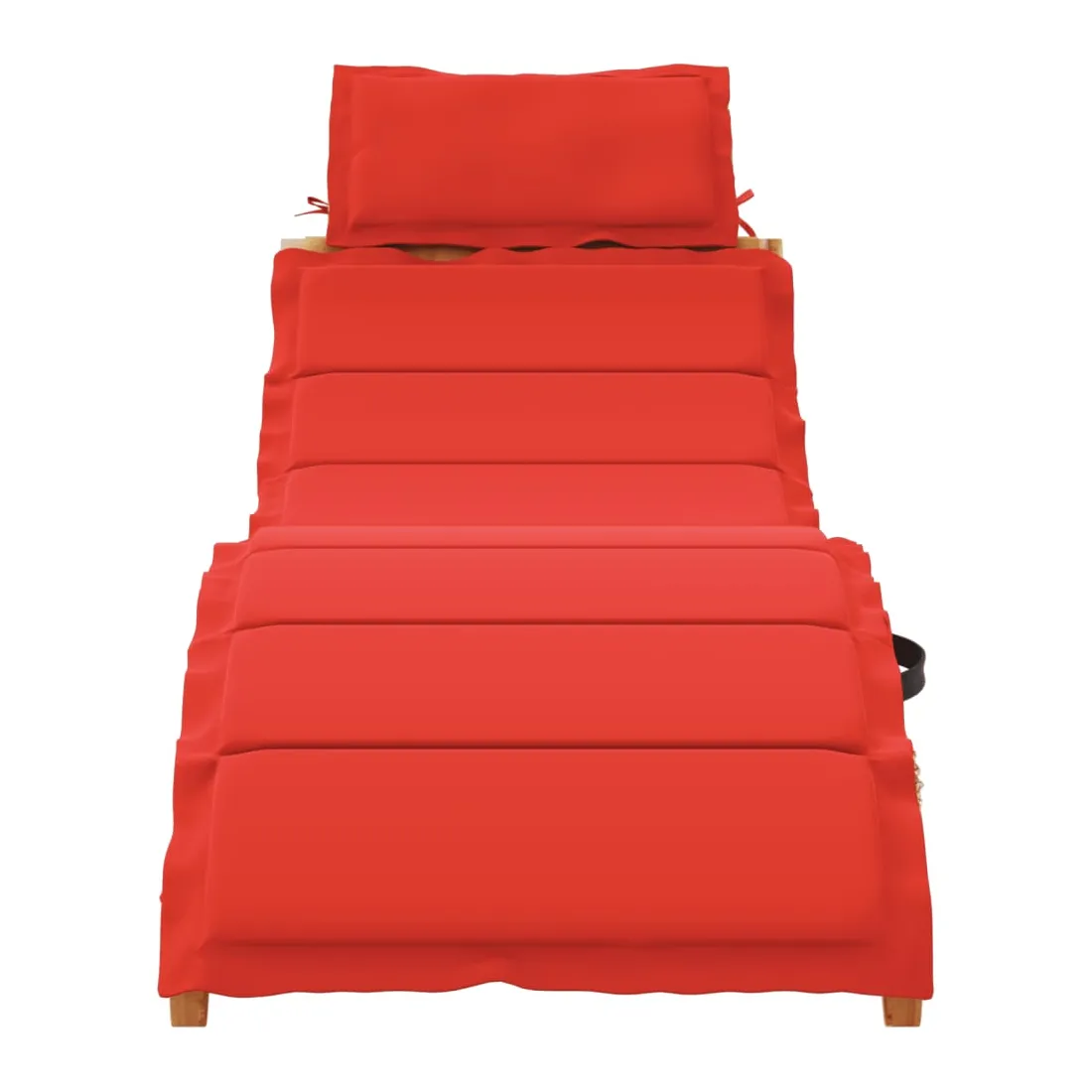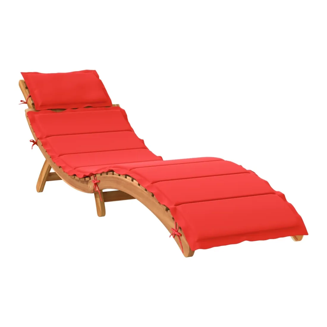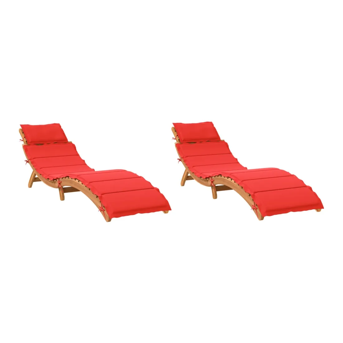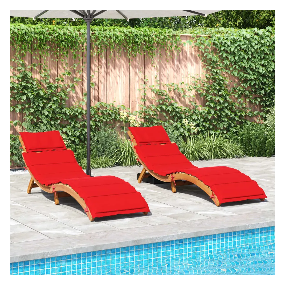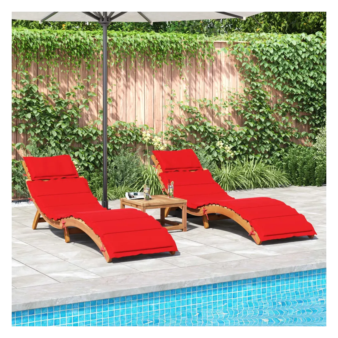 Avec un design attrayant, ces chaises longues sont idéales pour bronzer et se détendre près de la piscine, sur la terrasse ou dans le jardin. Bois d'acacia massif : la chaise longue est fabriquée en bois d'acacia massif, un bois dur tropical, qui est résistant aux intempéries et très durable.Expérience d'assise confortable : ce meuble d'extérieur, doté d'un coussin épais rembourré et d’un oreiller supplémentaire, offre une expérience d'assise confortable.Design à lattes : la chaise longue d'extérieur est dotée d'un design à lattes qui facilite le drainage de l'eau et ajoute une touche de charme naturel à votre espace de vie extérieur.Design pliable : cette chaise longue peuvent être pliée pour économiser de l'espace lorsqu'elle n’est pas utilisée.Nombreuses applications : la chaise longue d'extérieur, au design simple et intemporel, convient aux bords de piscine, aux balcons, aux jardins, aux patios, etc. Bon à savoir :Pour que vos meubles d'extérieur restent beaux, nous vous recommandons de les protéger avec une housse imperméable.
