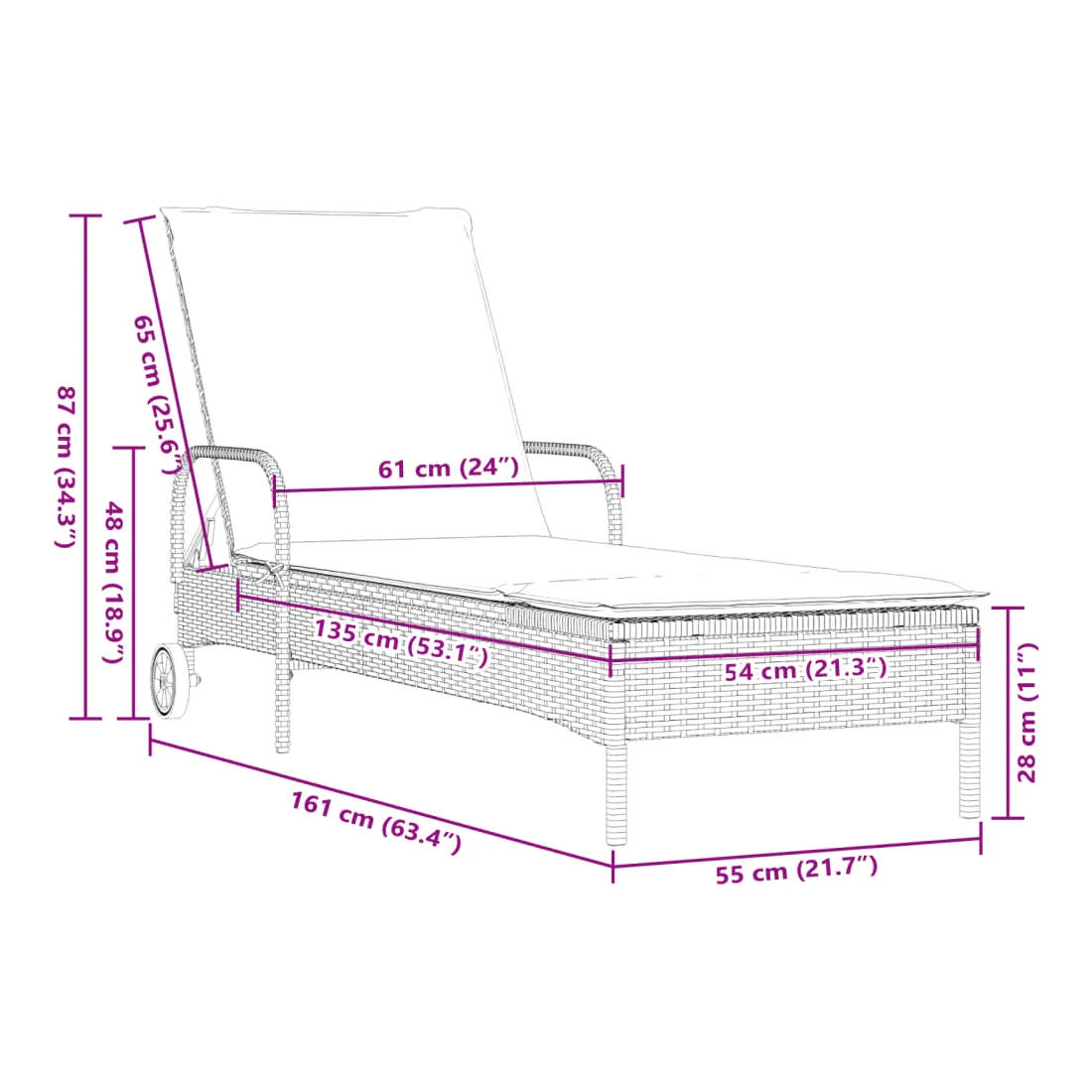 - Dimensions en position assise : 61 x 161 x 87 cm (l x P x H)