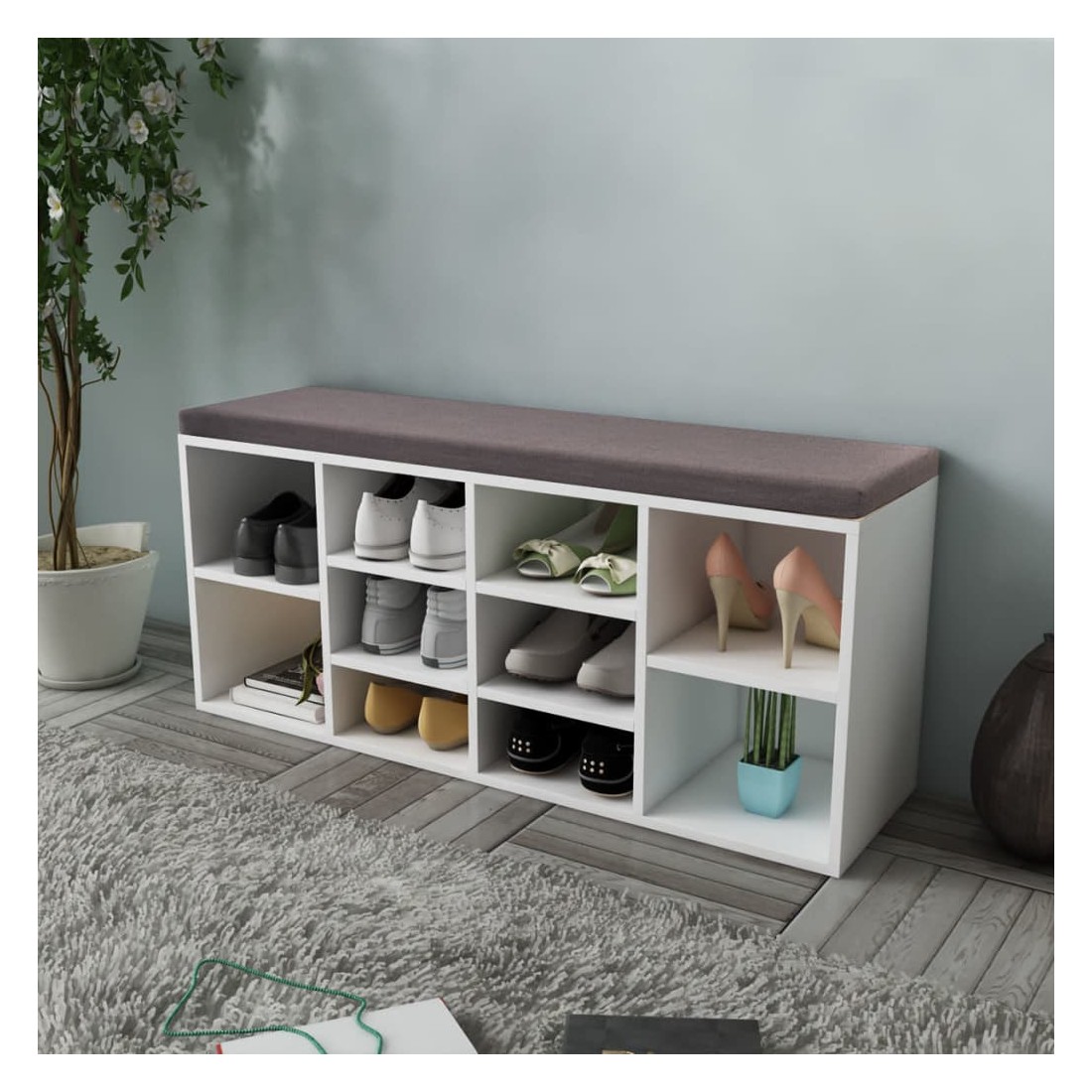 Ce banc à chaussures, au design simple mais élégant, sera un excellent ajout à votre décor intérieur. Le banc offre suffisamment d'espace pour ranger jusqu'à 10 paires de chaussures. Le haut est recouvert d'un tissu rembourré de mousse épaisse, vous pouvez donc vous asseoir confortablement tout en enlevant ou en mettant vos chaussures. Fabriqué en matériaux de haute qualité, le banc de rangement pour chaussures est très robuste et durable. La livraison comprend également des accessoires d'assemblage. L'assemblage est très facile.