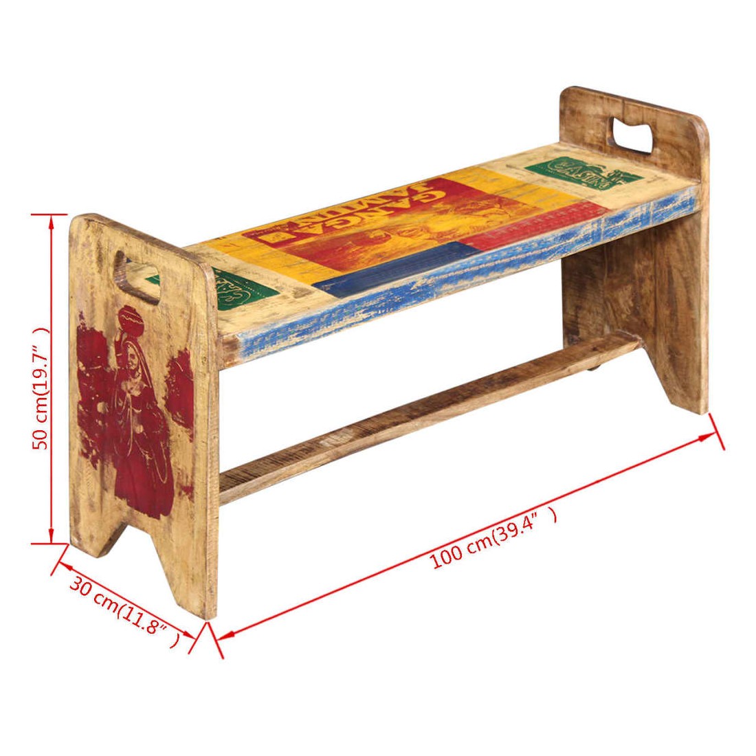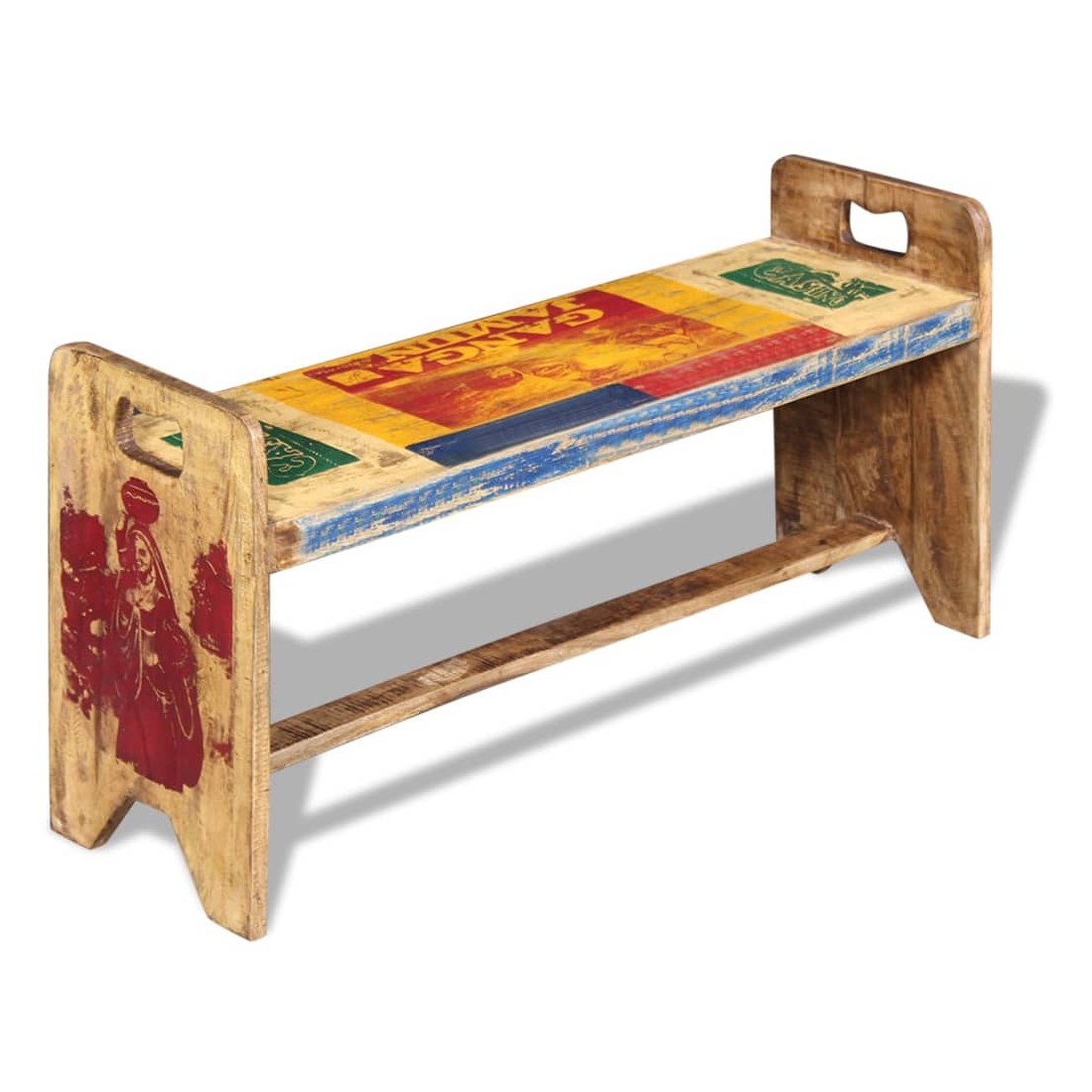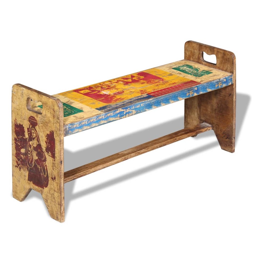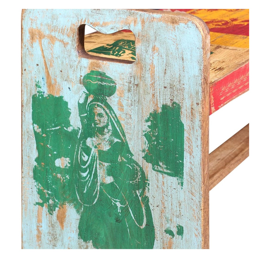 Ce banc en bois de style antique sera un supplément unique à votre maison. Sa construction en bois massif le rend stable, robuste et adapté à un usage quotidien. Avec un motif décoratif coloré, ce banc égaye instantanément votre décor. Ce banc de style vintage est fabriqué en bois massif de récupération, ce qui signifie que chaque meuble est unique et légèrement différent l'un de l'autre. Les meubles en bois de récupération ont les caractéristiques de différents bois comme le teck, le bois de manguier et l'acacia. Le bois de récupération est solide, stable, durable et beau. Des signes d'usure et une structure de grain visible donnent à chaque pièce sa propre histoire et un aspect unique. Ce banc est construit à la main et la qualité de l'artisanat s'ajoute à son style rétro spectaculaire. Chaque étape du processus est effectuée avec le plus grand soin, qu'il s'agisse de la recombinaison, du polissage, de la peinture ou du cirage. Remarque importante : les couleurs varient d'une pièce à l'autre, rendant chacun de nos bancs unique. La livraison est aléatoire, ce qui garantit l'exclusivité et l'individualité de votre produit.
