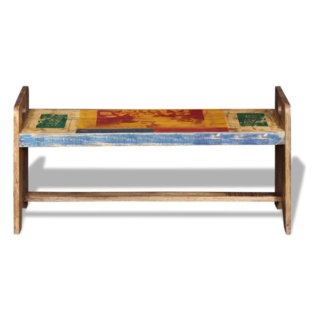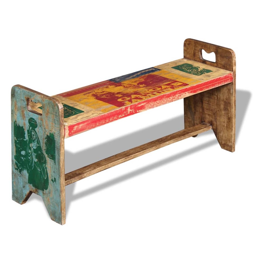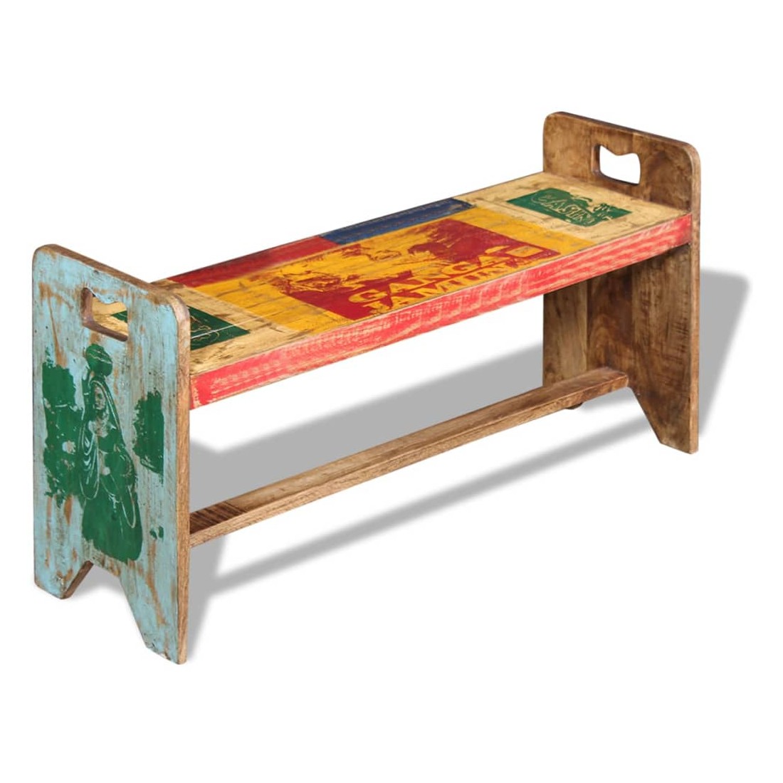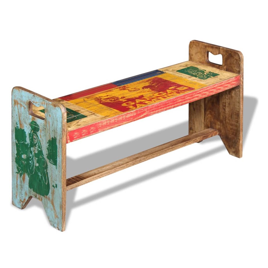 Ce banc en bois de style antique sera un supplément unique à votre maison. Sa construction en bois massif le rend stable, robuste et adapté à un usage quotidien. Avec un motif décoratif coloré, ce banc égaye instantanément votre décor. Ce banc de style vintage est fabriqué en bois massif de récupération, ce qui signifie que chaque meuble est unique et légèrement différent l'un de l'autre. Les meubles en bois de récupération ont les caractéristiques de différents bois comme le teck, le bois de manguier et l'acacia. Le bois de récupération est solide, stable, durable et beau. Des signes d'usure et une structure de grain visible donnent à chaque pièce sa propre histoire et un aspect unique. Ce banc est construit à la main et la qualité de l'artisanat s'ajoute à son style rétro spectaculaire. Chaque étape du processus est effectuée avec le plus grand soin, qu'il s'agisse de la recombinaison, du polissage, de la peinture ou du cirage. Remarque importante : les couleurs varient d'une pièce à l'autre, rendant chacun de nos bancs unique. La livraison est aléatoire, ce qui garantit l'exclusivité et l'individualité de votre produit.