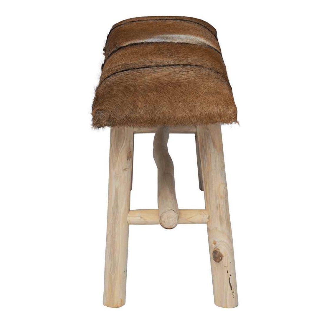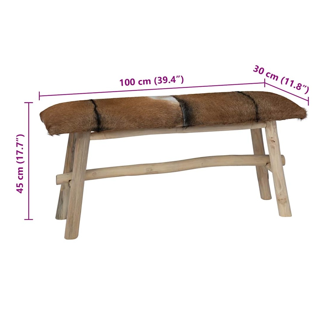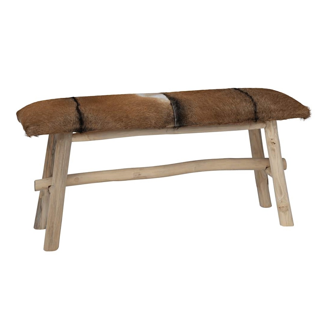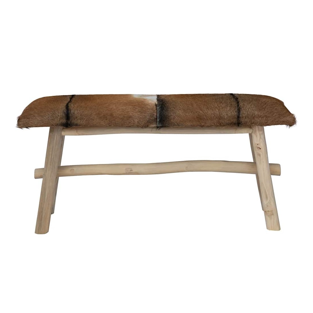 Ce banc en cuir de chèvre véritable a un design unique et saisissant, et ajoutera une touche de charme rustique aux restaurants ou aux bars, mais aussi à votre salon ou salle à manger à la maison. Le banc dispose d'un cadre solide en teck, le rendant stable et très durable. Le siège est rembourré en 100% cuir de chèvre véritable. Le cuir de chèvre poilu est doux au toucher et confortable. Le beau motif de cuir naturel rend chacun de nos bancs unique et légèrement différent de l'autre. Grâce au rembourrage doux dans le siège, vous apprécierez le plus grand confort d'assise. Les pieds à la couleur de bois naturel s'ajoutent à l'attrait rustique du banc. Remarque : Les couleurs et les motifs varient d'une pièce à l'autre. La livraison est aléatoire. L'article est déjà assemblé ; aucun assemblage n'est requis.