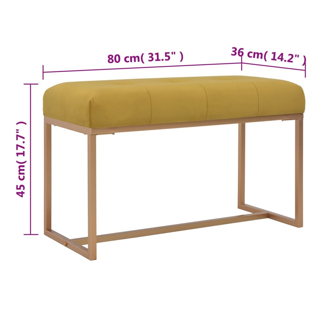 Notre banquette en velours sera un excellent supplément à votre salon ou entrée. La tapisserie d'ameublement en velours de couleur moutarde est douce au toucher et très confortable, donnant une touche de couleur à votre intérieur. De plus, les pieds en fer enduit de poudre ajoutent de la stabilité et de la durabilité au banc d’entrée. Notre banc de couloir décorera avec élégance votre espace de vie et sera une partie indispensable de votre pièce. Le banc en velours est facile à assembler.