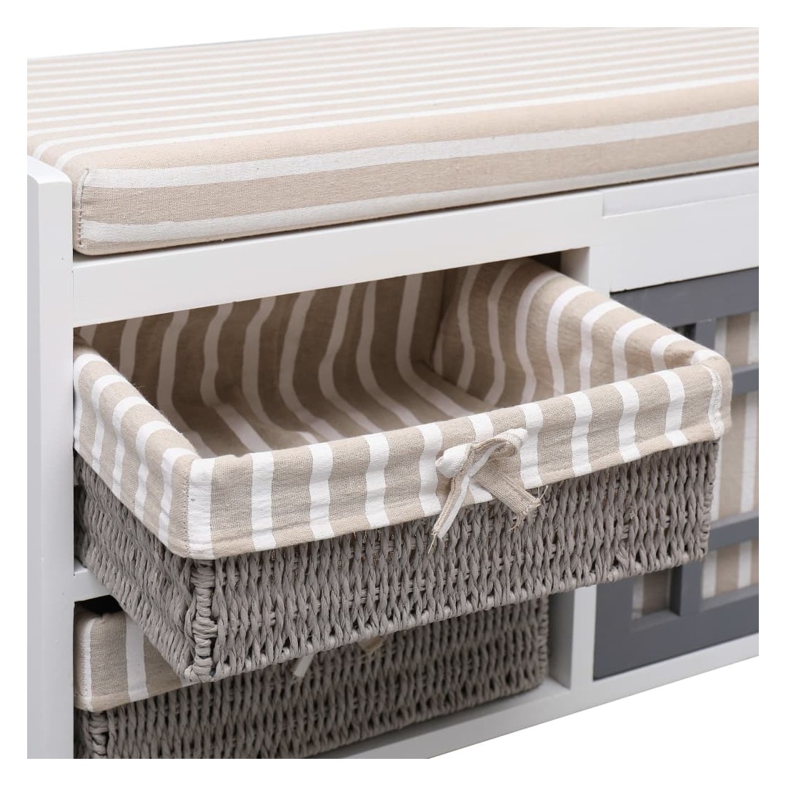 vidaXLCréez un environnement chaleureux et accueillant juste à côté de votre porte avec notre banc d'entrée ! Avec ses tiroirs et son coussin sur le dessus, ce banc de couloir sera un supplément remarquable à votre entrée, salon ou chambre à coucher ! Fabriqué en bois de paulownia et en MDF, le banc d’entrée est considérablement stable et durable. Avec un coussin moelleux, vous pouvez vous asseoir confortablement. Ce banc d'entrée offre un grand espace de rangement avec 2 tiroirs et 1 porte. Il est facile d'essuyer avec un chiffon humide. Notre banc de rangement est déjà assemblé ; aucun assemblage n'est requis.