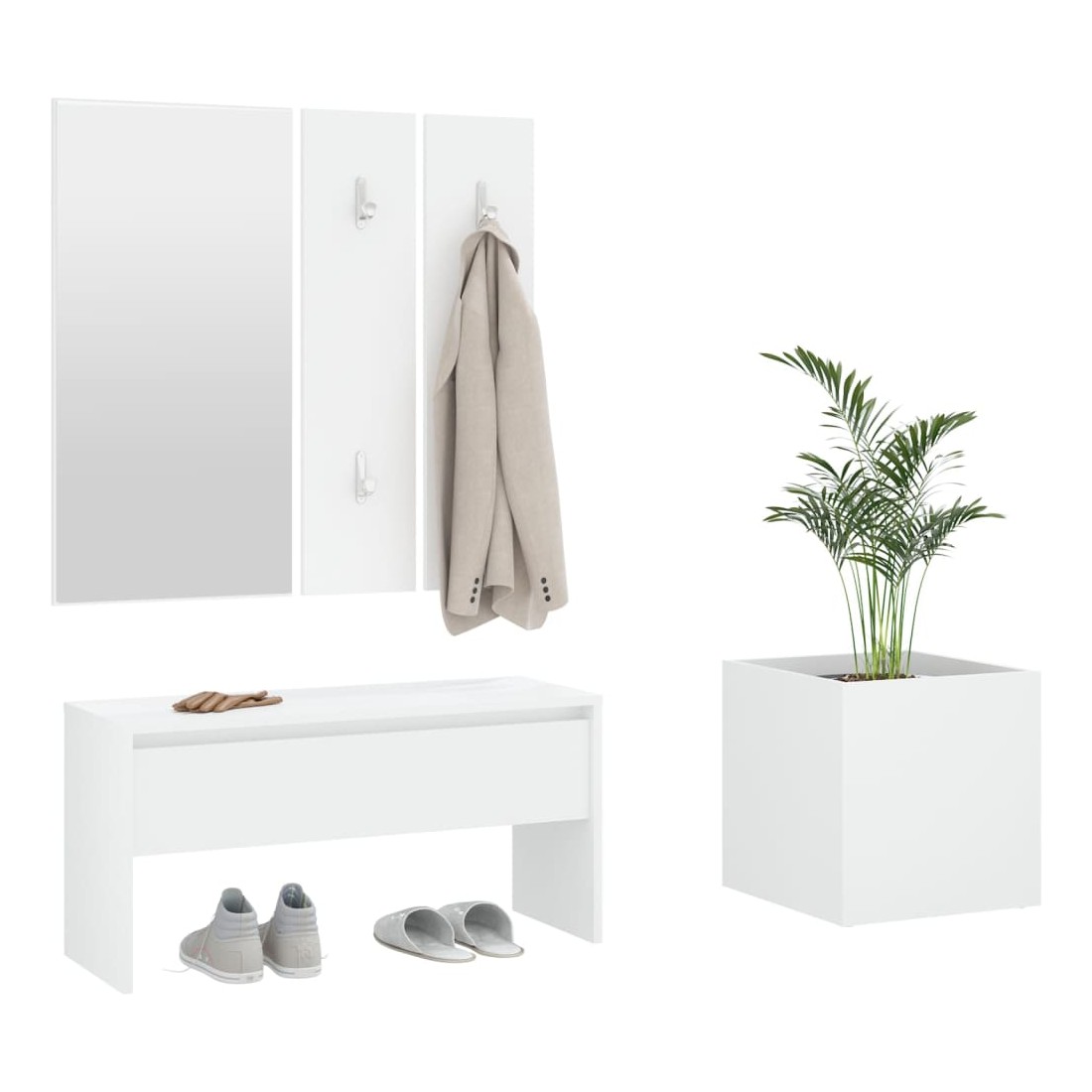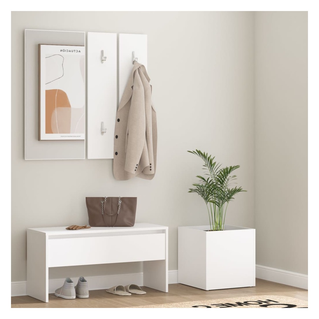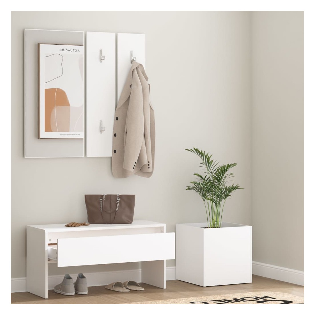 Créez un environnement chaleureux et accueillant juste à côté de votre porte avec cet ensemble de meubles de couloir ! Matériau robuste : le bois d'ingénierie est d'une qualité exceptionnelle avec une surface lisse et présente également résistance, stabilité et résistance à l'humidité.Grand espace de rangement : le banc d'entrée avec un tiroir offre un grand espace de rangement pour ranger des chaussures ou d'autres articles essentiels.Banc multifonctionnel : le banc peut être utilisé comme rangement ou pour placer vos objets décoratifs préférés dans votre espace de vie, il sert également de siège lorsque vous enfilez ou enlevez vos chaussures.Design pratique : le miroir pratique et les porte-manteaux sont pratiques pour suspendre vos vêtements et regarder dans le miroir.Belle jardinière : la jardinière est idéale pour faire pousser des plantes et des fleurs, ce qui en fait un excellent supplément à votre intérieur. Remarque :Chaque produit est livré avec un manuel de montage dans la boîte pour un montage facile.Les vis et les chevilles pour l'intérieur du mur ne sont pas incluses. Recherchez et utilisez des vis et des chevilles adaptées à vos murs. Si vous n'êtes pas sûr, demandez conseil à un professionnel. Lisez et suivez attentivement chaque étape des instructions.